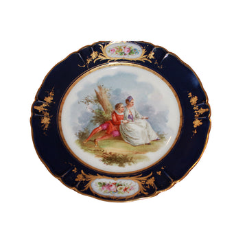 Elegante piatti francesi Sevres in porcellana decorati, caratterizzati da un raffinato bordo blu cobalto impreziosito...