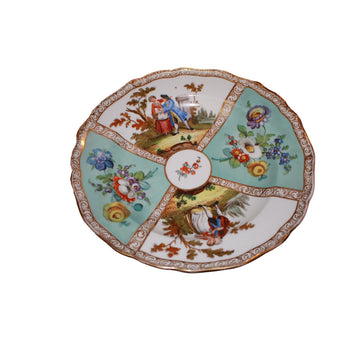 Piatto in porcellana Meissen finemente decorato, caratterizzato da una composizione elegante e tipicamente settecentesca. La...