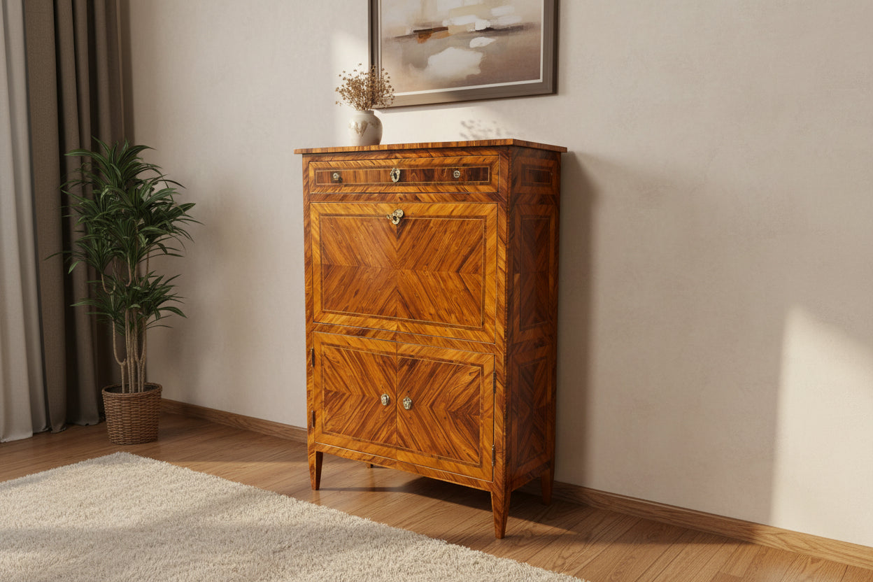 Das Möbelstück verfügt über eine Schublade unter der Platte, eine Schreibklappe sowie zwei Türen im unteren Bereich, die Funktionalität und ausgewogene Proportionen vereinen.