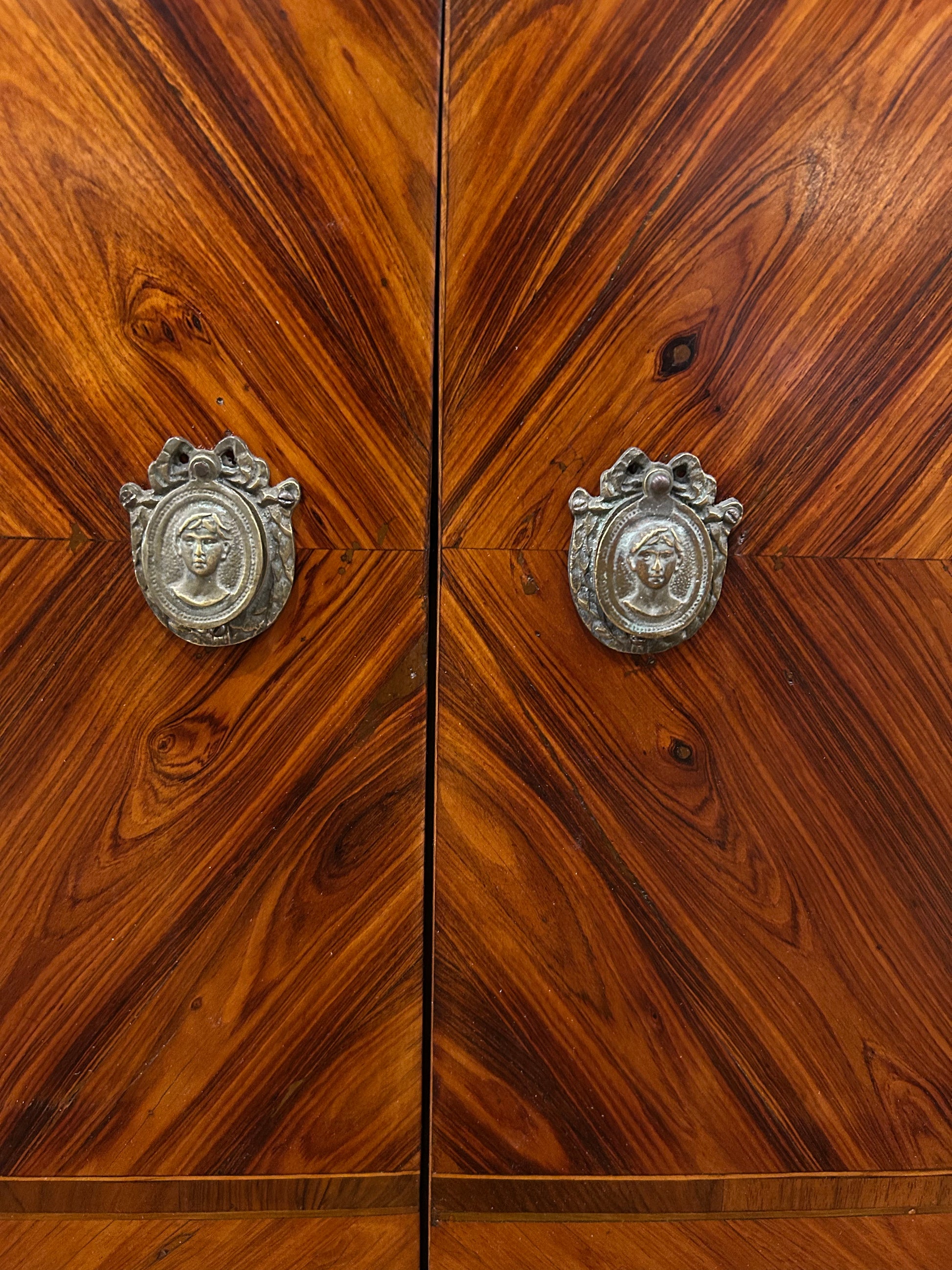 Fein gearbeitete Bronzeschlüsselschilder vervollständigen das Gesamtbild und unterstreichen die Qualität dieses erlesenen Beispiels französischer Möbelkunst des 18. Jahrhunderts.