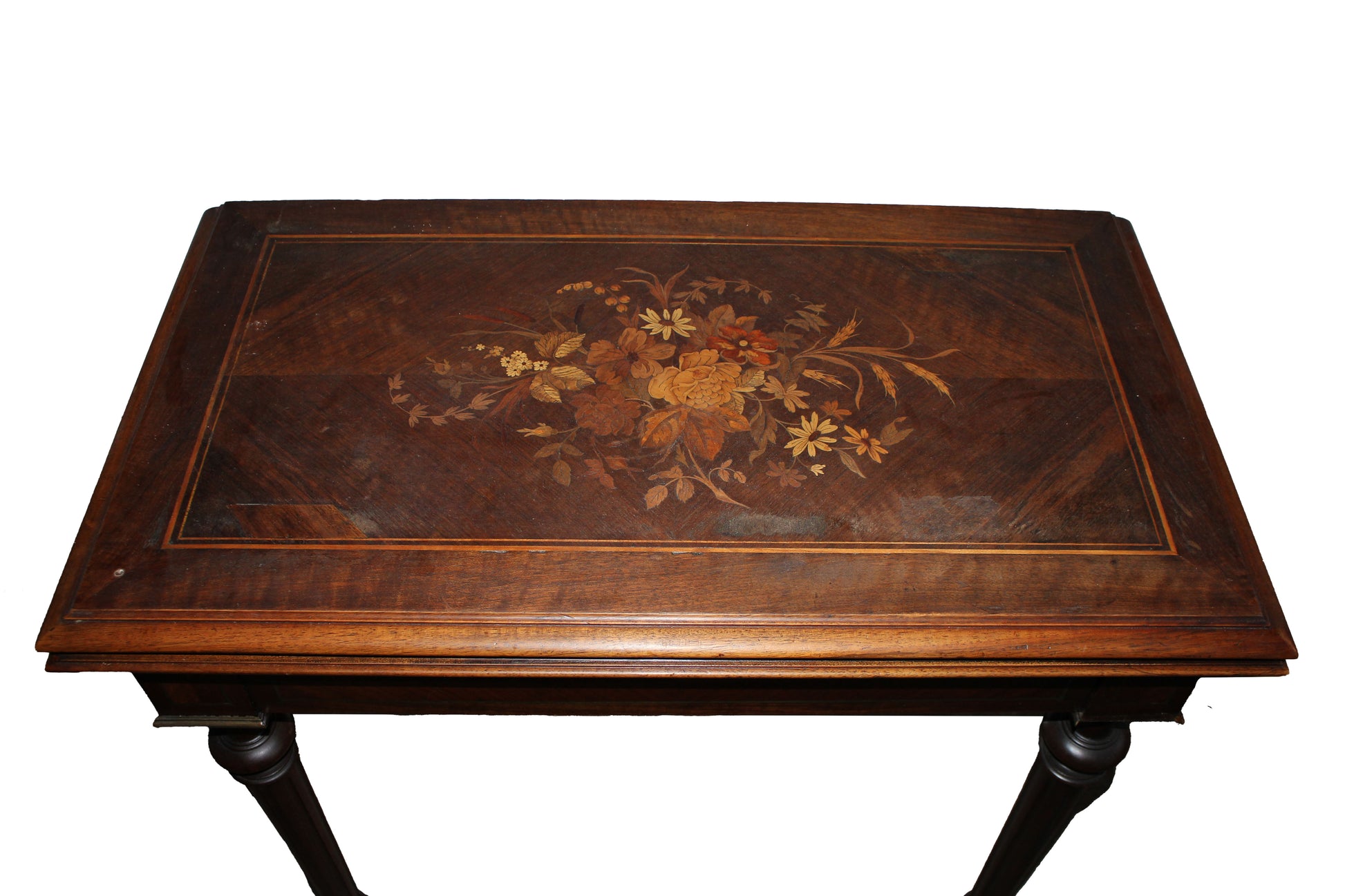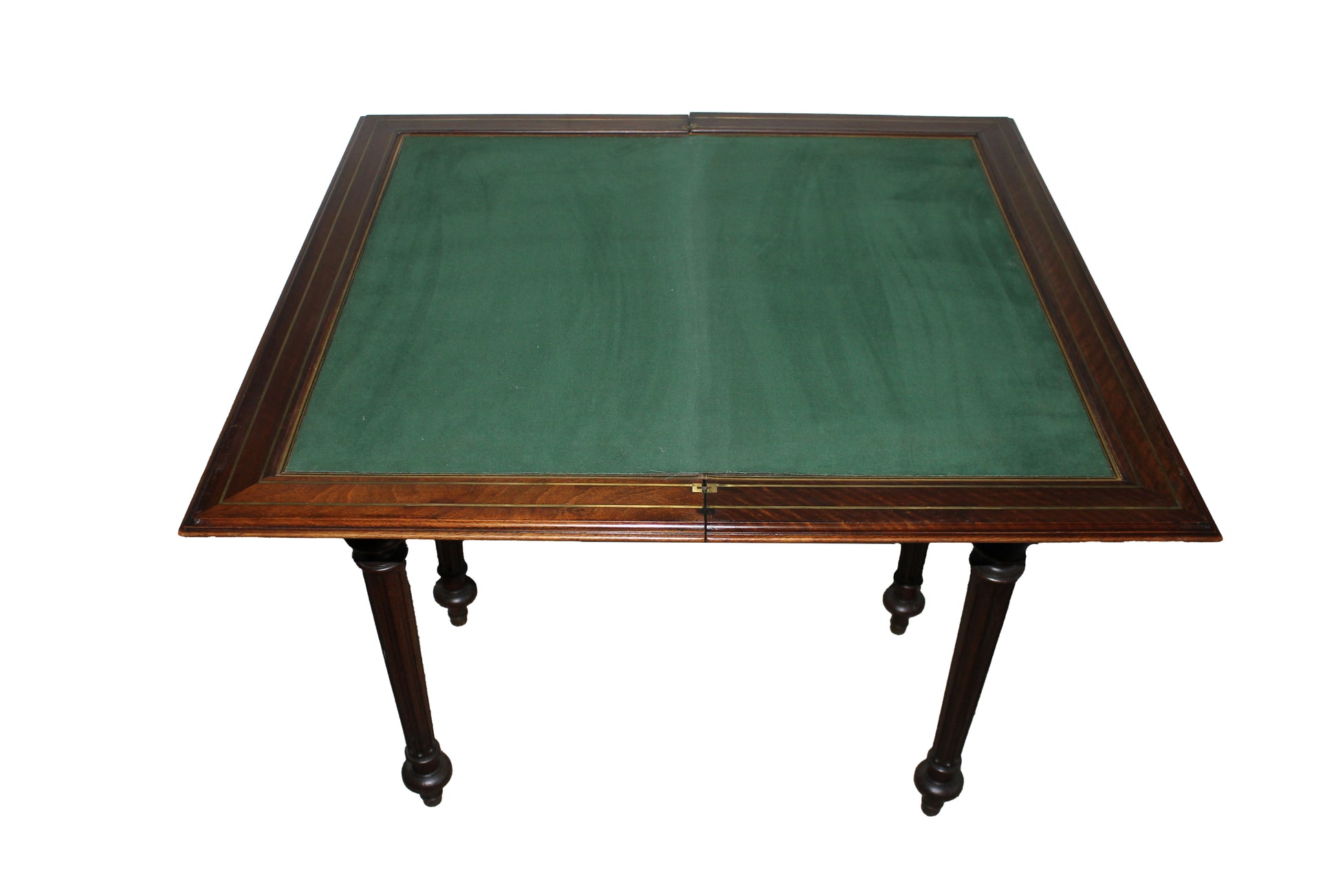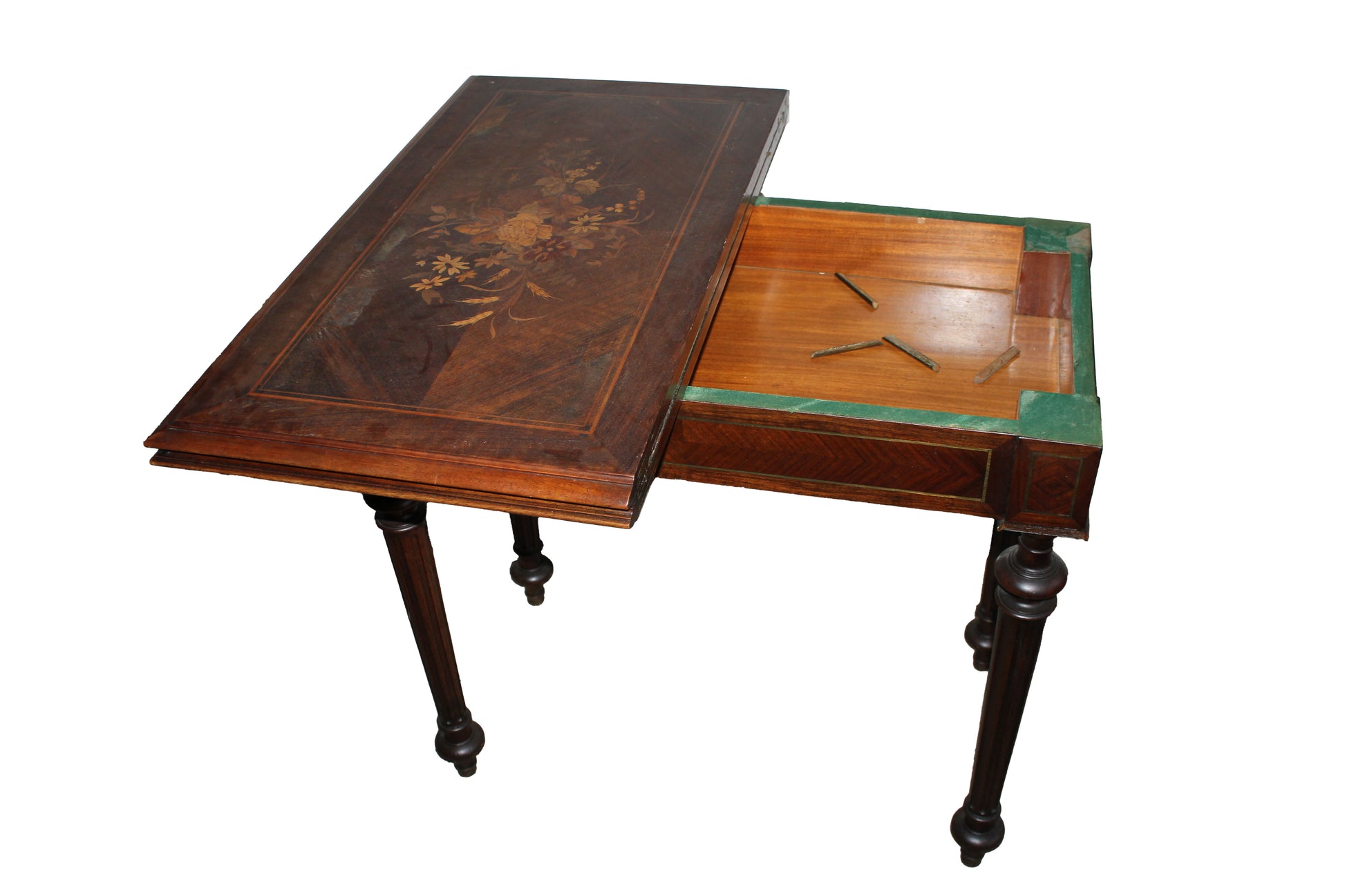 Eleganter französischer Spieltisch aus der zweiten Hälfte des 19. Jahrhunderts, gefertigt aus Palisanderholz im edlen Louis-XVI-Stil. Der Tisch ist reich mit Intarsien verziert, besitzt schlanke konische Beine und eine klappbare, aufdoppelbare Tischplatte, die Funktionalität und neoklassische Eleganz vereint.