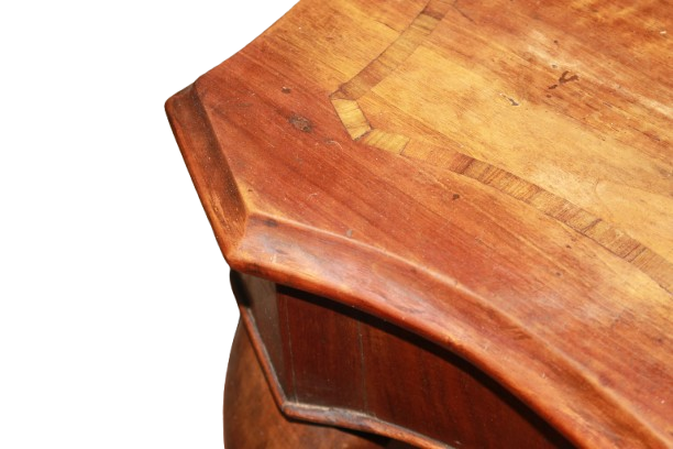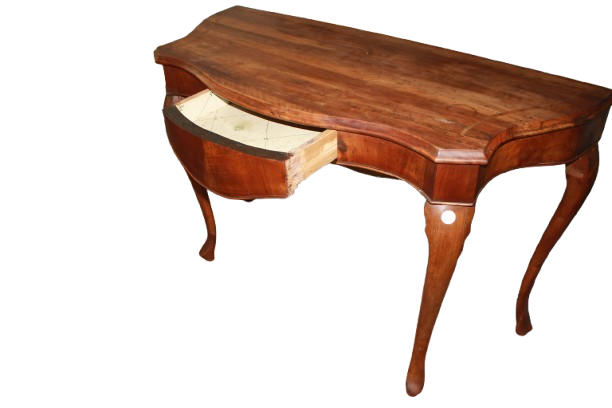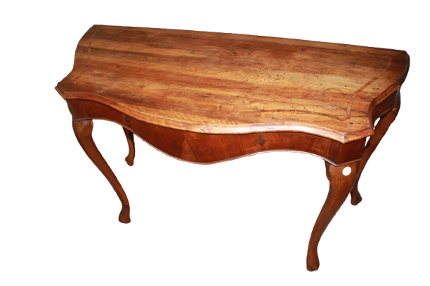 Sie verfügt über eine Platte mit feinem Intarsienfilet, eine praktische Schublade sowie schön geschwungene Beine, typisch für die Epoche.