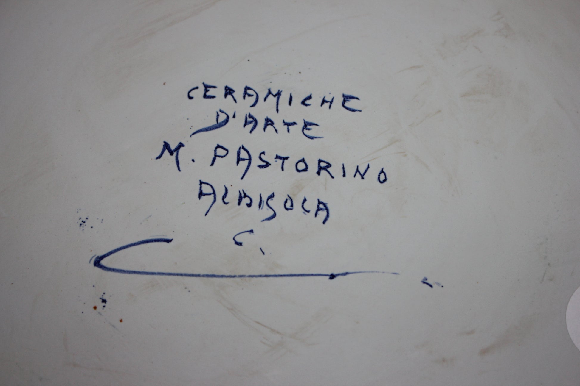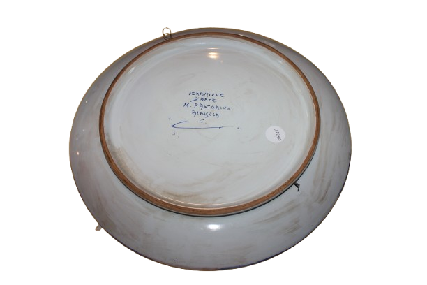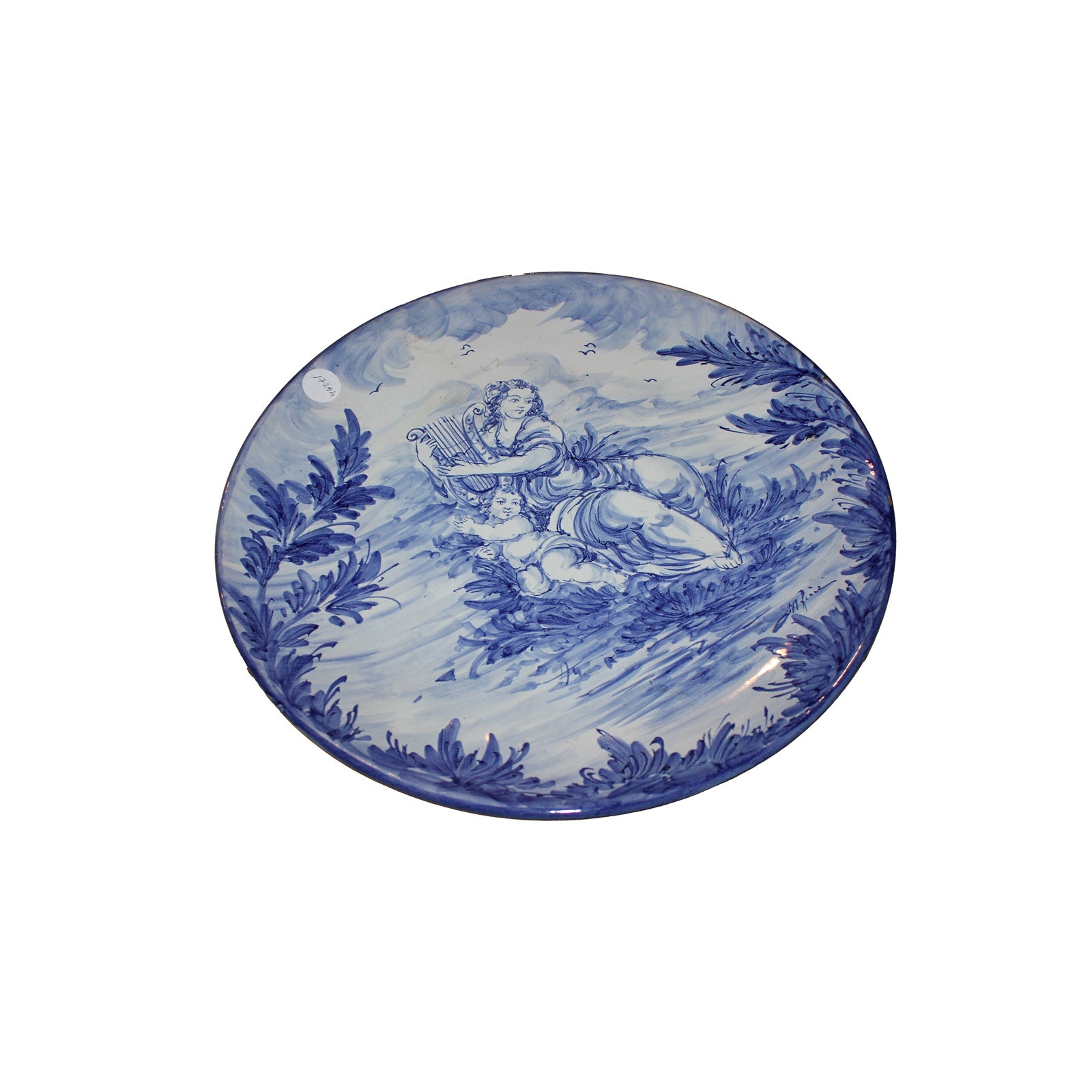 Raffinierter italienischer Keramikteller aus dem frühen 20. Jahrhundert, dekoriert in der klassischen blau-weißen Farbgebung. In der Mitte ist eine zarte allegorische Szene mit einem Putto und einer Dame mit Lyra dargestellt, inspiriert von klassischen Themen, die Harmonie, Musik und die Eleganz der traditionellen italienischen Kunst widerspiegeln.