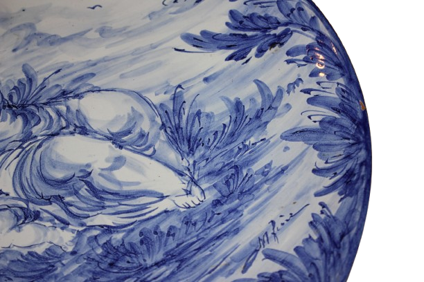 Italienischer Blau-Weiß-Keramikteller – Anfang 20. Jahrhundert, Allegorische Szene mit Putto und Dame