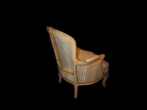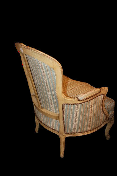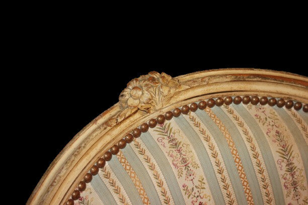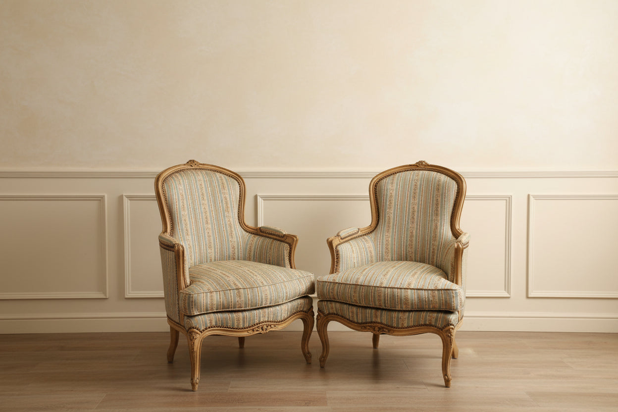 Die Fauteuils sind mit feinen Schnitzereien versehen und mit Stoff in einwandfreiem Zustand bezogen, was die Harmonie von Handwerkskunst und Komfort der Epoche unterstreicht.
