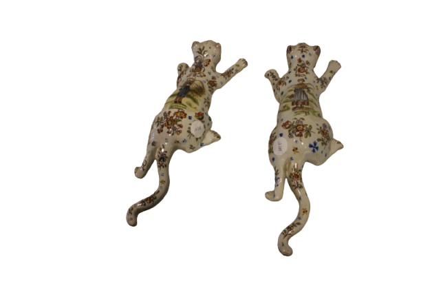 Die Darstellungen zeigen zwei Katzen: eine mit dem Bildnis einer Dame, die andere mit einem eleganten Herrn, ausgeführt mit sorgfältigen Details und zarten Farbtönen, typisch für die französische Porzellanherstellung um 1900.