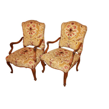 Elegant pair of French high-back armchairs from the mid-19th century, crafted in solid walnut wood.The...