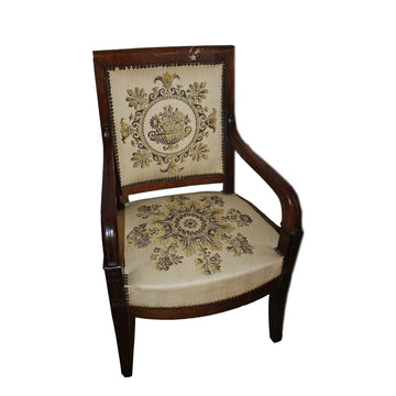 Elegant French armchair from the mid-1800s in Directoire style, made of solid mahogany. Features upholstered...