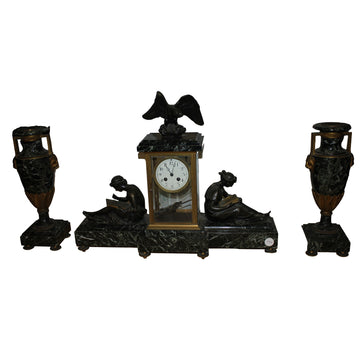 French Empire Marble Clock Set with Matching Vases – 19th Century, Gilt Bronze and Verde Alpi Marble