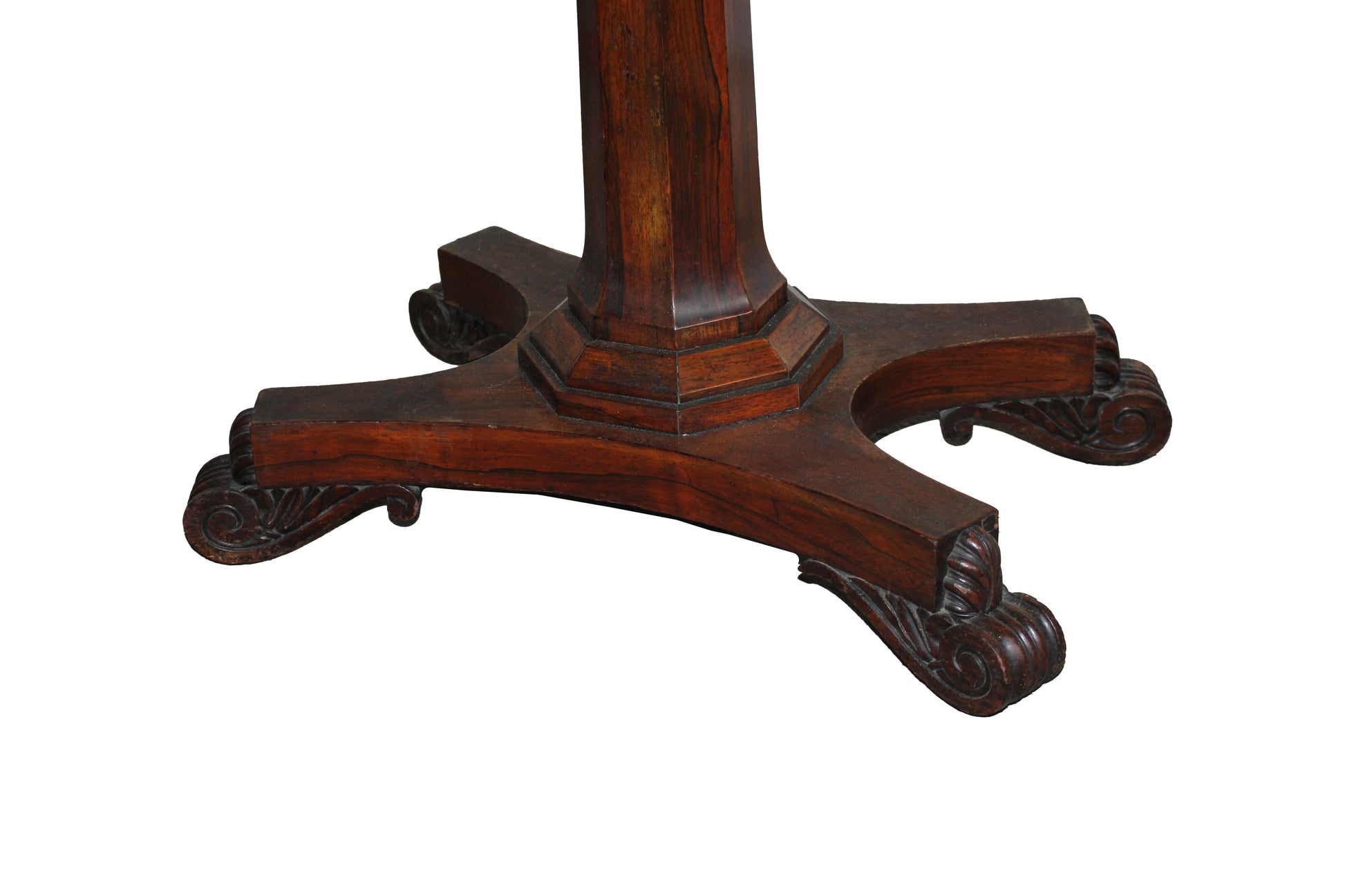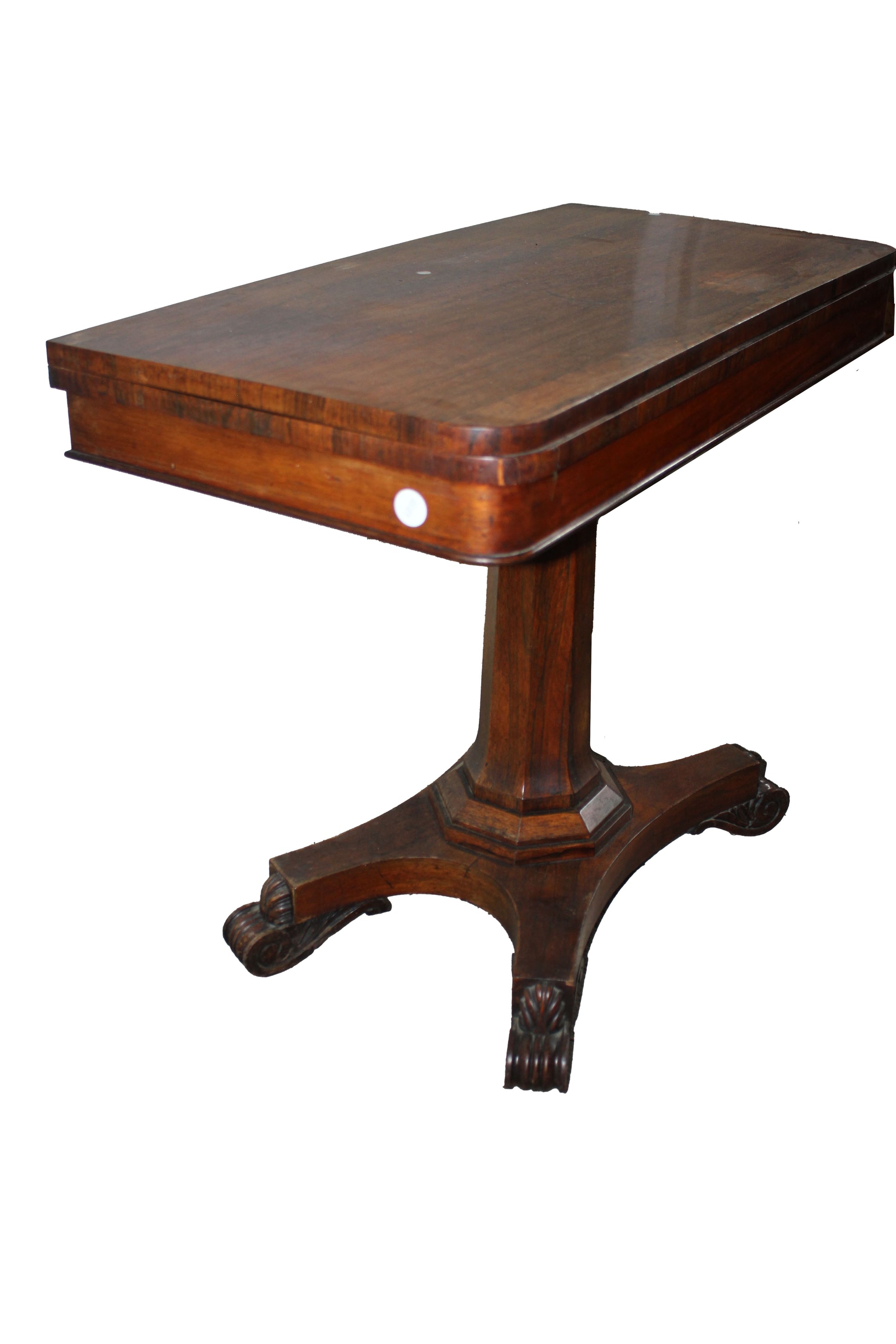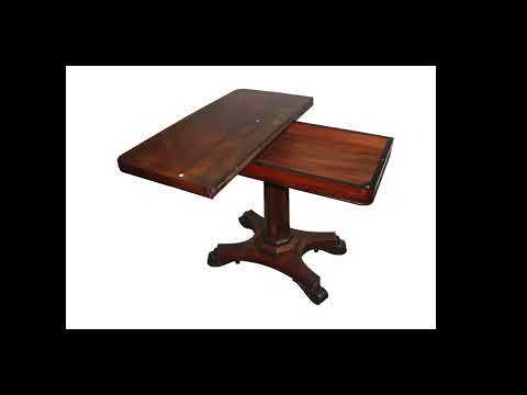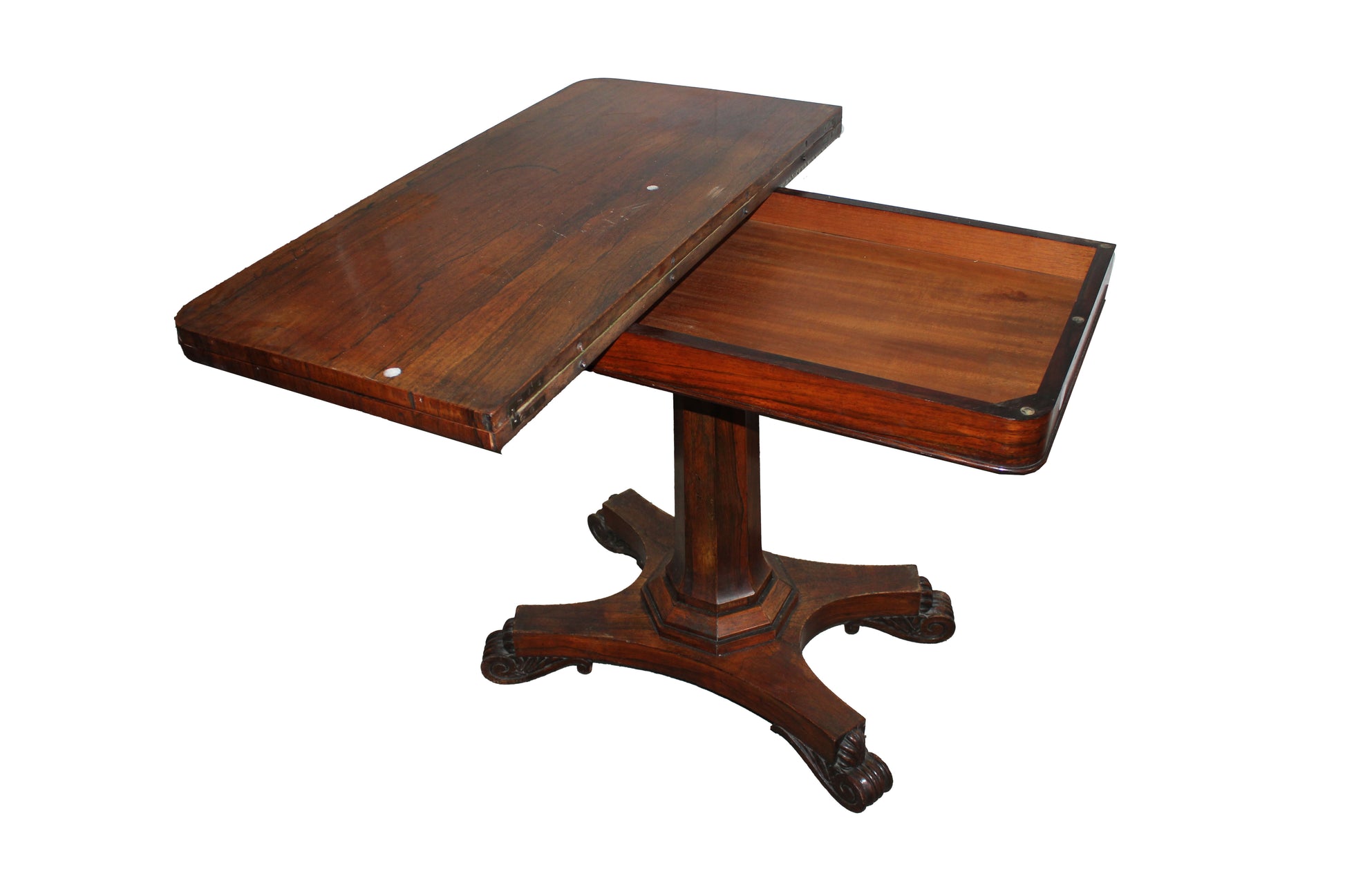 Elegant English games table dating to the mid-19th century, crafted in fine rosewood and inspired by the Regency style. The table features a folding swivel top with a book-opening mechanism, revealing a green felt playing surface. The four finely carved legs are joined by a central pedestal base, ensuring stability and refined proportions. A refined antique piece, ideal for collectors and classic interiors.