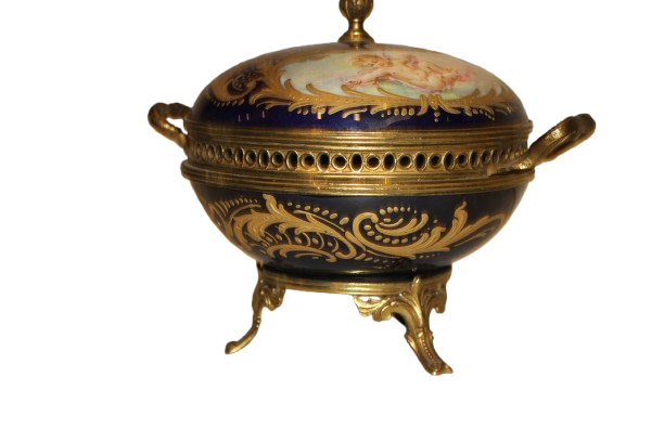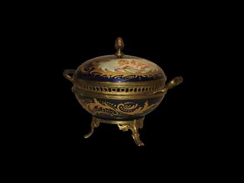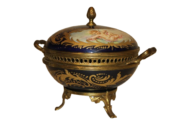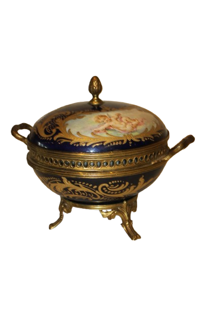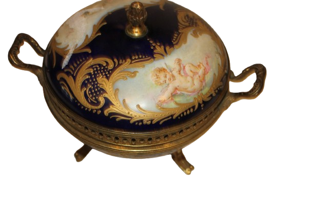 French Blue Porcelain Jewelry Box Centerpiece with Gilt Putti – Early 1900s