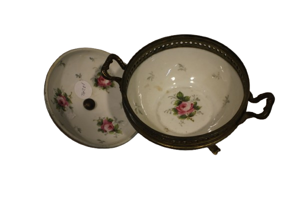 The delicate figurative scenes and the brilliance of the gilding enhance its refined appearance. The centerpiece is completed with gilded bronze feet, adding stability and ornamental value.