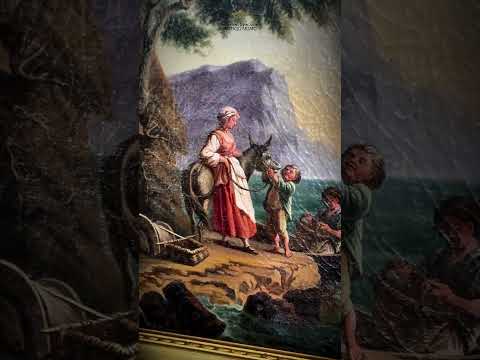 French oil on canvas from the early 1800s depicting a scene of family life. The return of the fisherman marine scene representing the return of the fisherman from fishing, his wife and son waiting for him with a pack donkey to transport the nets and the catch. Contemporary golden frame.