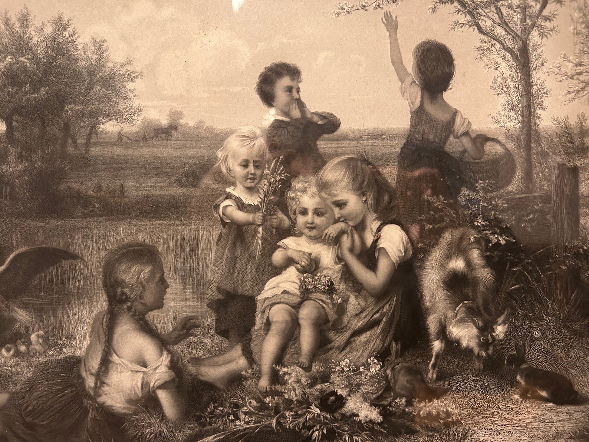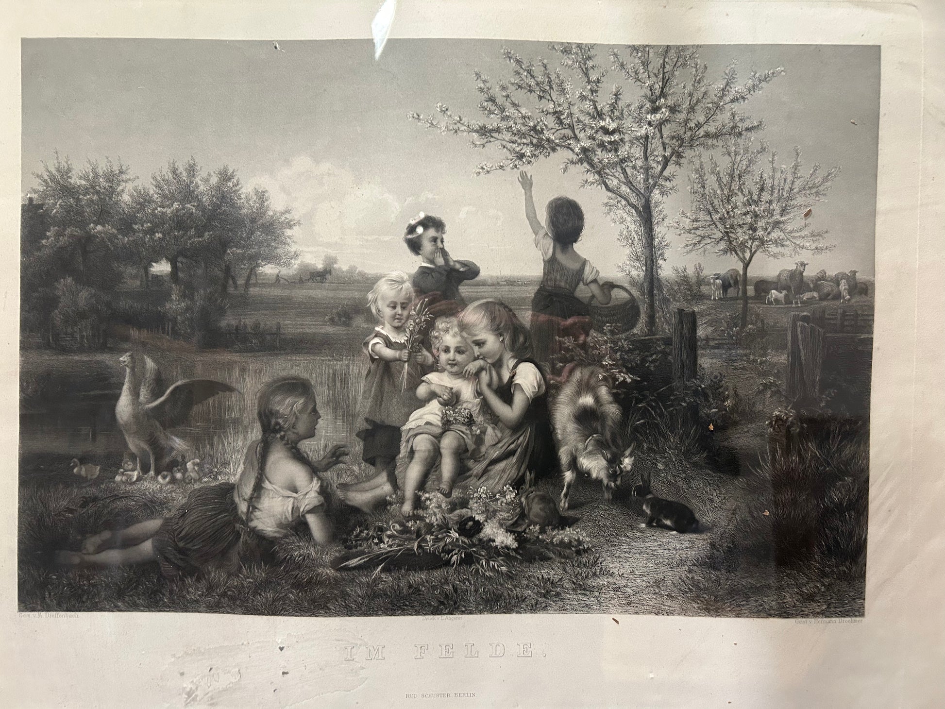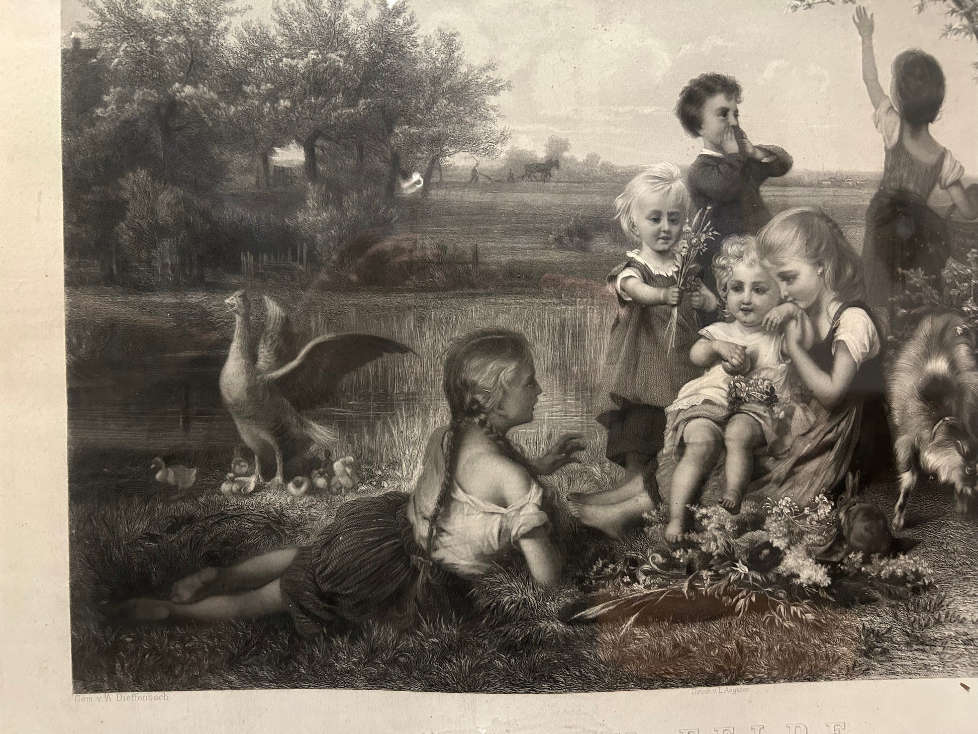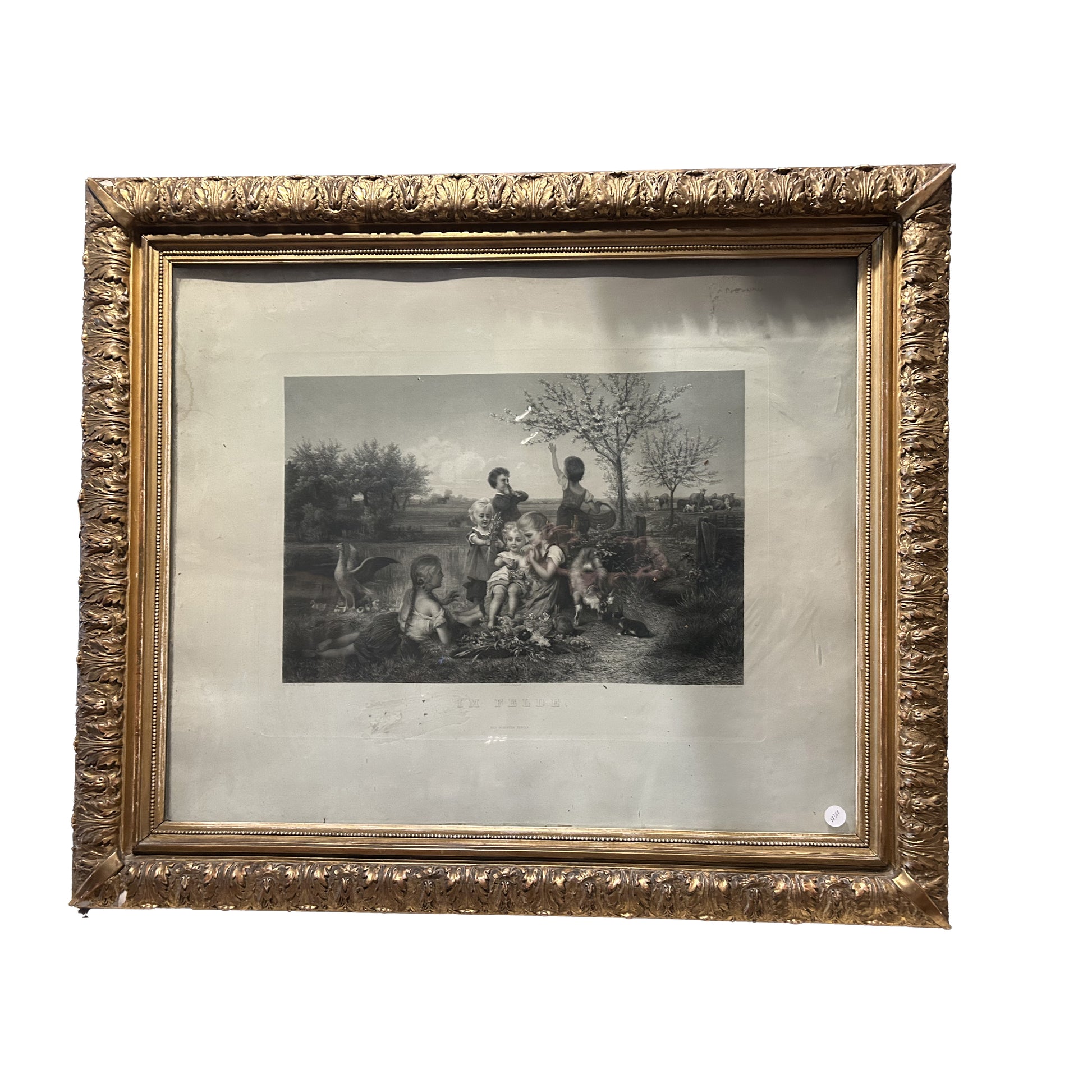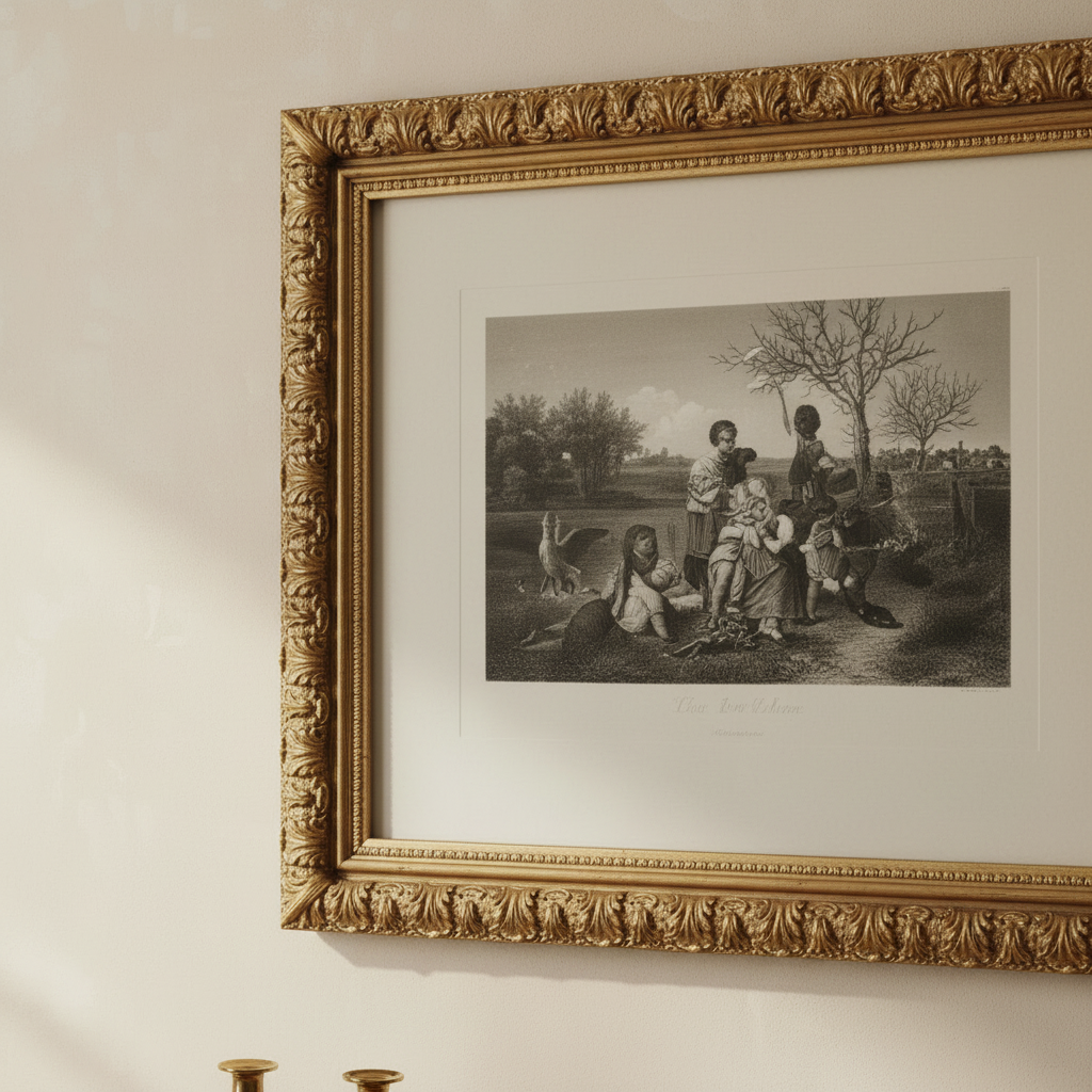German print in a romantic-realist taste, dating from the mid to late 19th century, set in a refined original gilt frame of the same period. The frame is richly decorated with embossed motifs of leaves and scrolls, enhancing the artwork’s decorative appeal. A charming and elegant piece, ideal for classic interiors or collectors.