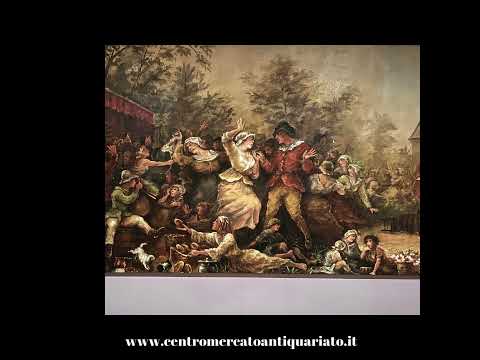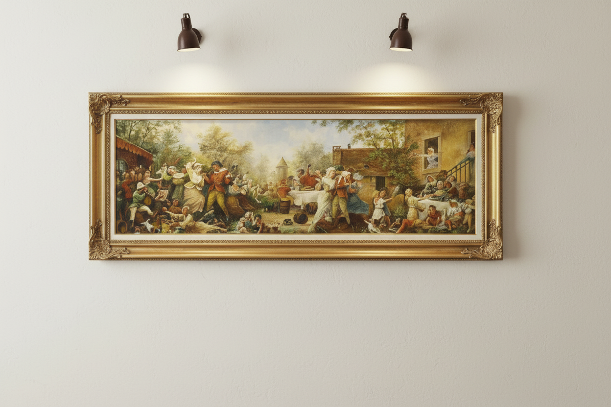The composition captures the joyful atmosphere of an outdoor rural celebration, with dynamic figures and a wide scenic landscape that enhances its decorative impact. Thanks to its remarkable panoramic dimensions, this artwork becomes a striking statement piece, perfect for large interiors, halls, restaurants, or prestigious spaces.