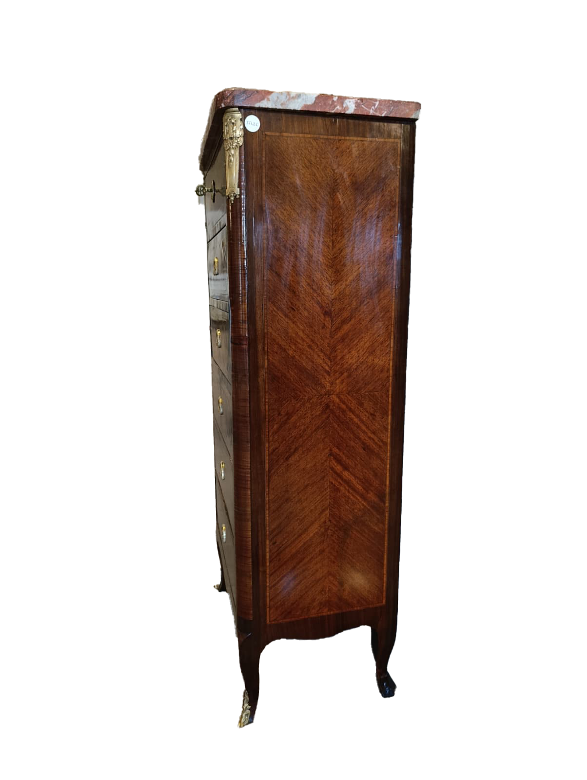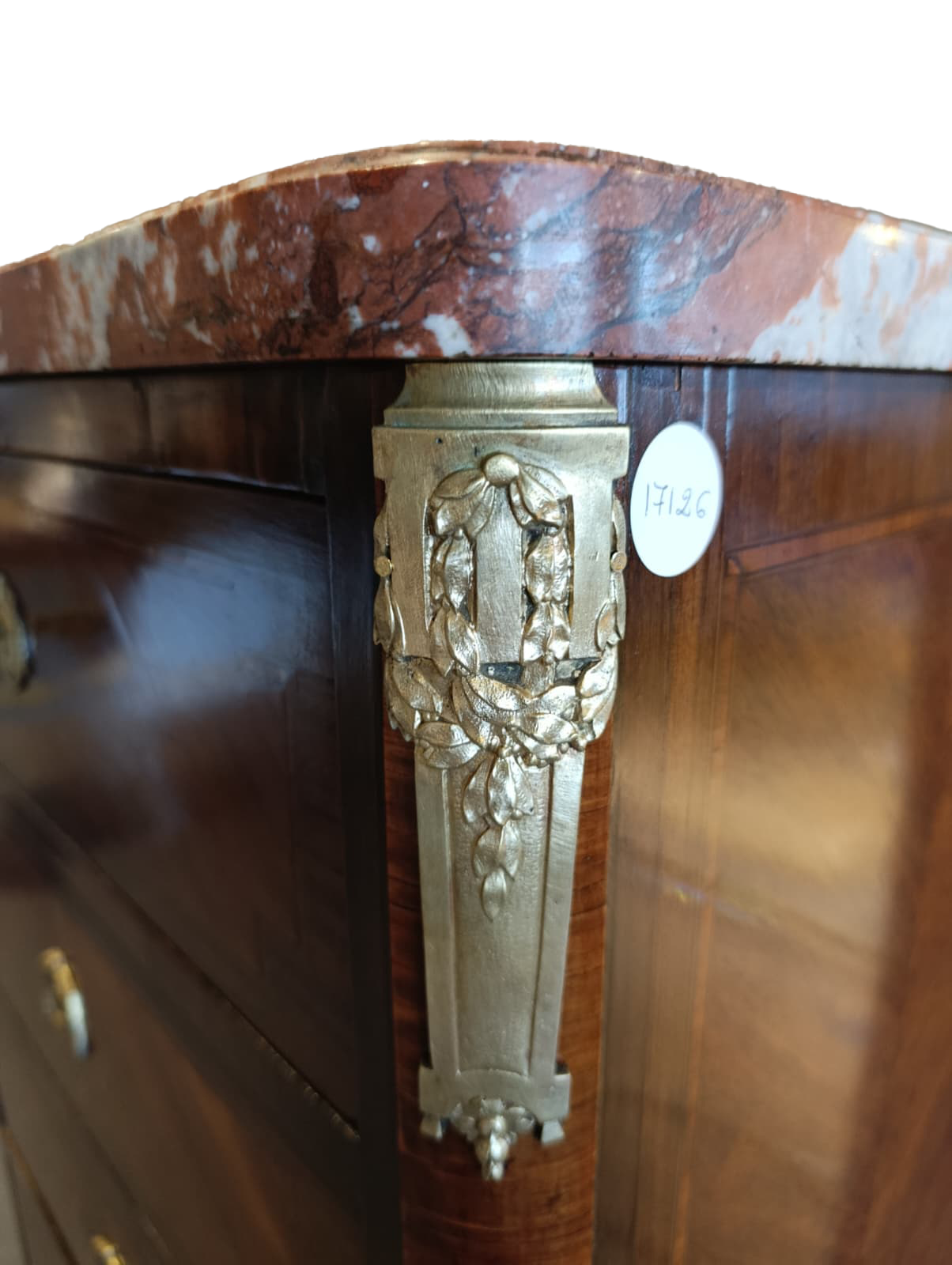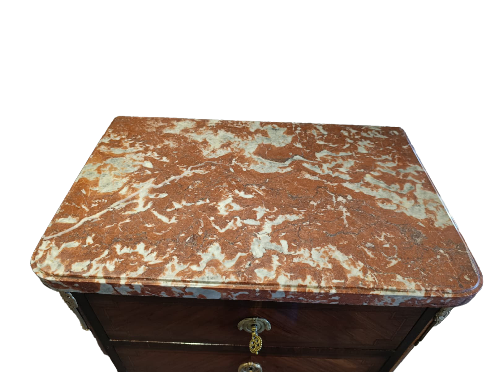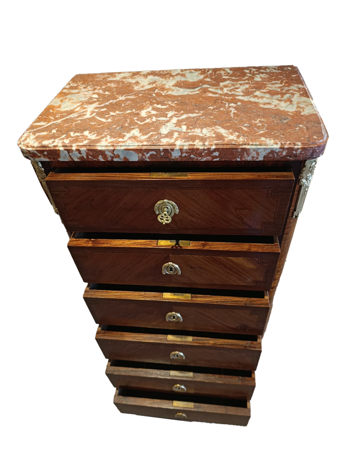 The piece of furniture features six drawers arranged in three rows, a Rosso Francia marble top shaped along the perimeter, gilded bronze applications and inlay fillets in light woods.