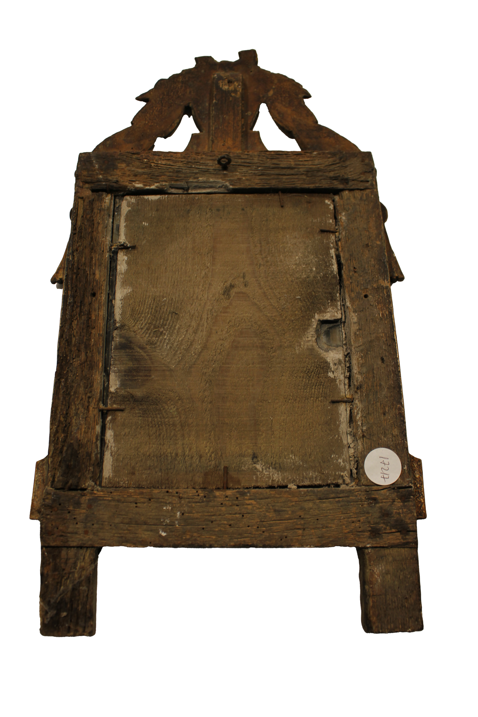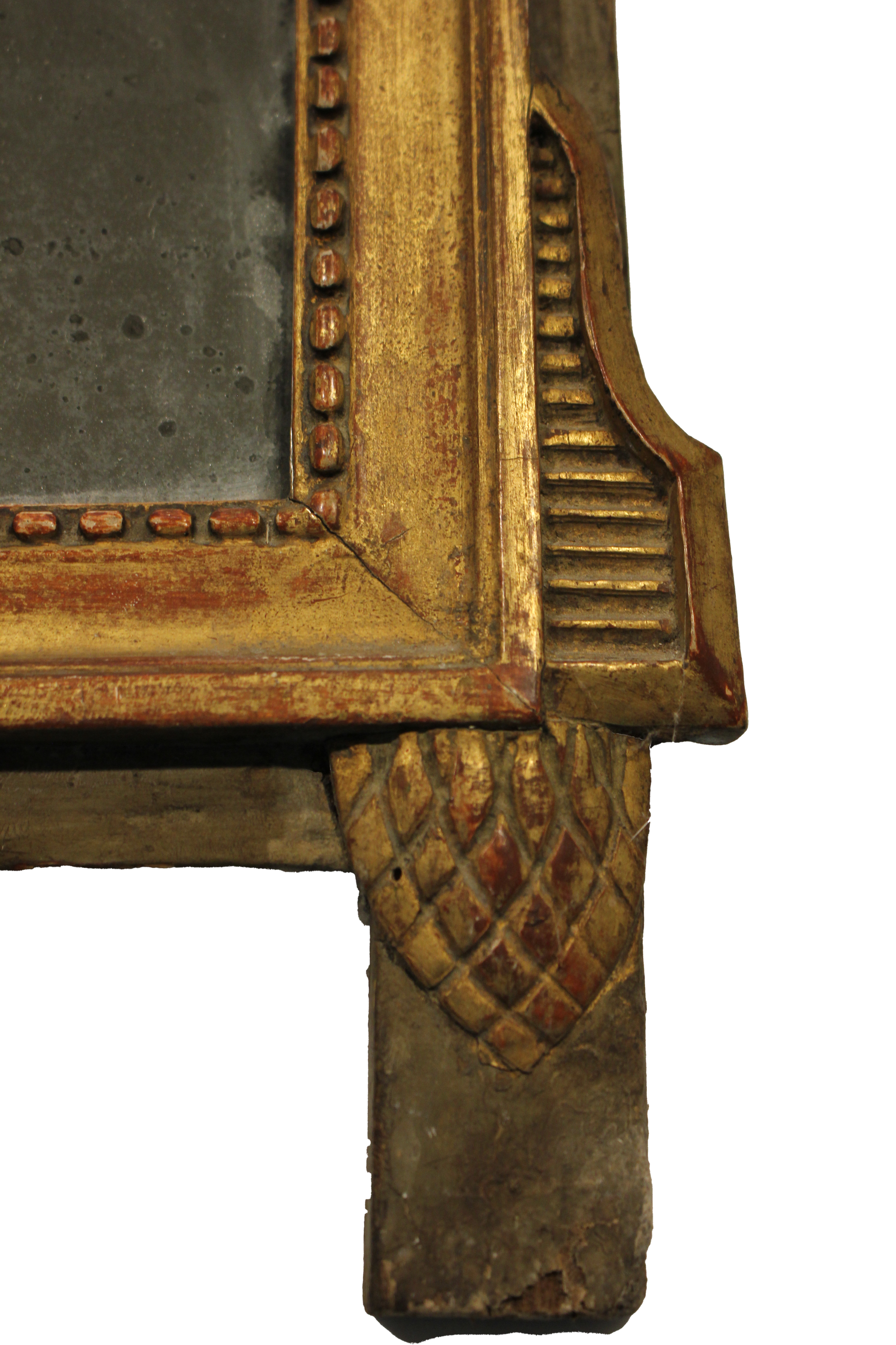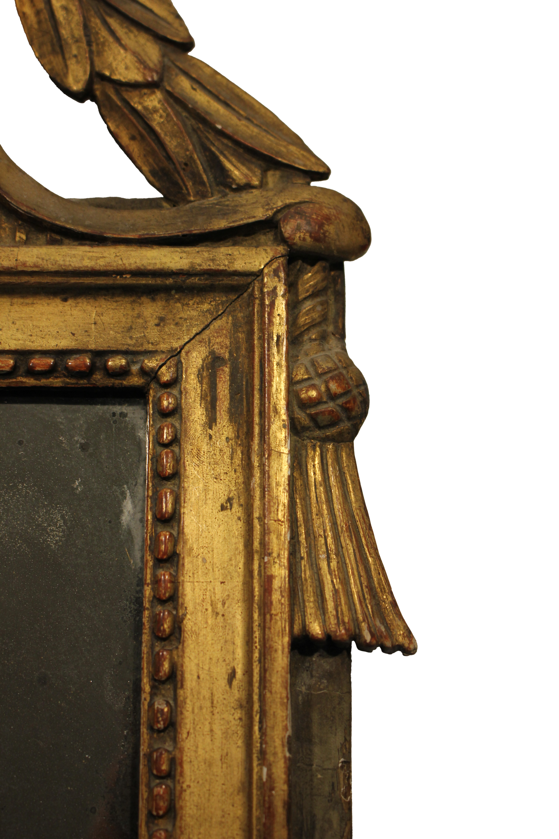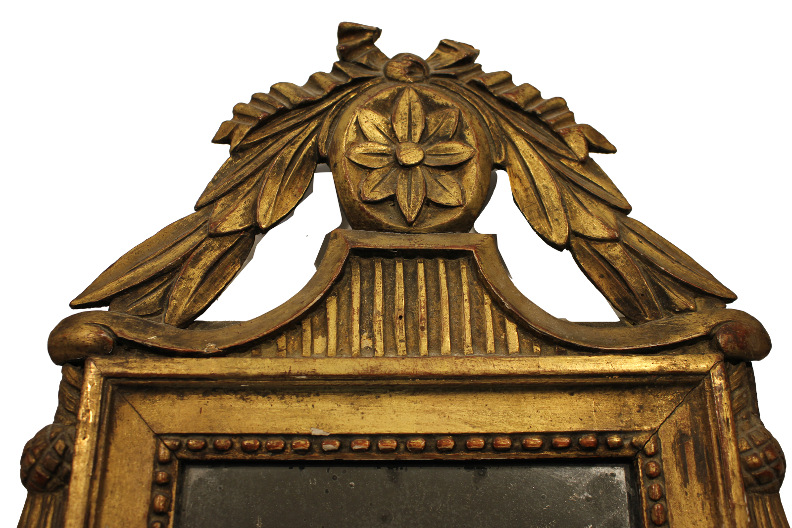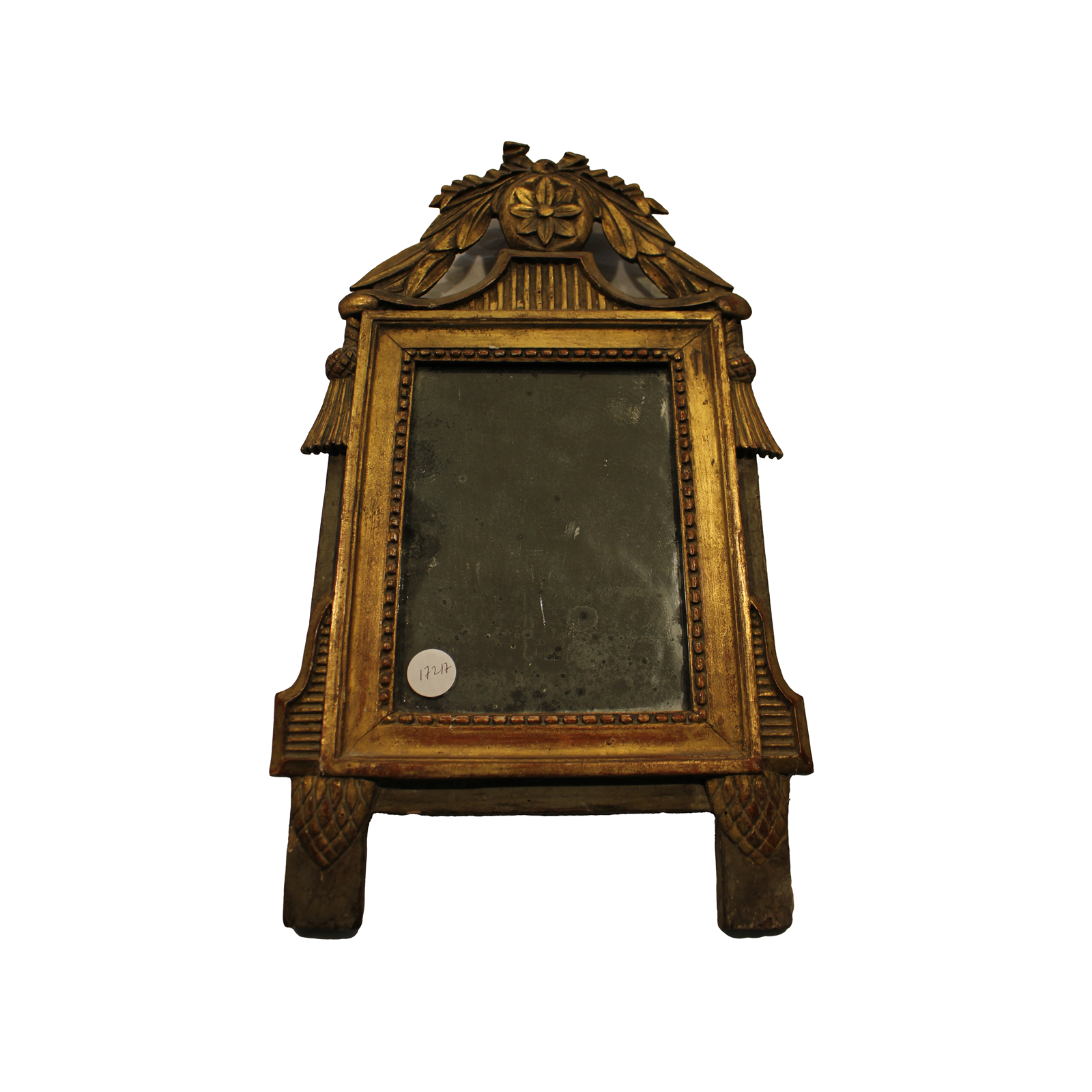 Charming small French mirror dating to the late 18th century, crafted in finely gilded wood in elegant Louis XVI style. The mirror features a decorative pediment (cimasa) in the upper section, reflecting the refined neoclassical taste of French decorative arts of the period.