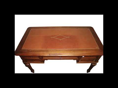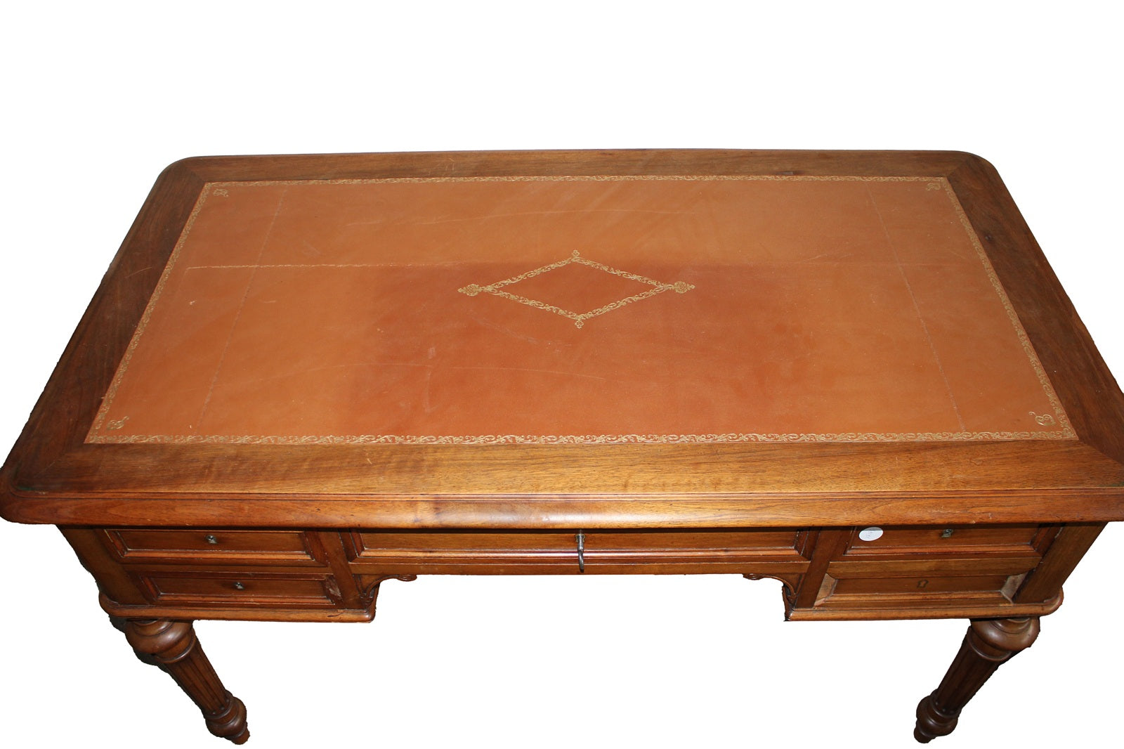 Élégant bureau français de la seconde moitié du XIXe siècle, de style Louis XVI, réalisé en noyer massif. Il présente un plateau d’écriture gainé de cuir en parfait état, deux tablettes latérales coulissantes également recouvertes de cuir, cinq tiroirs et quatre pieds cannelés caractéristiques du style Louis XVI.