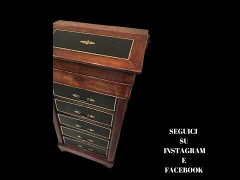 Il présente un plateau supérieur en pupitre (à leggio) avec un dessus en cuir, idéal comme petit meuble de bureau ou pour le rangement de documents et dossiers.