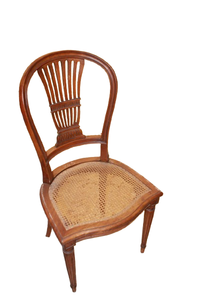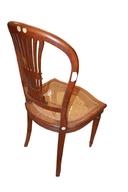 Chaque chaise présente un dossier ajouré et une assise en cannage (paille de Vienne), alliant légèreté, confort et élégance classique. Les lignes sobres et les proportions équilibrées reflètent l’esthétique néoclassique propre au style Louis XVI.