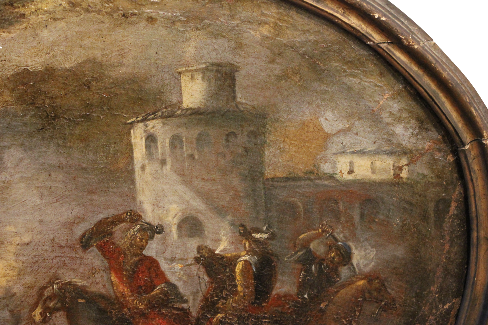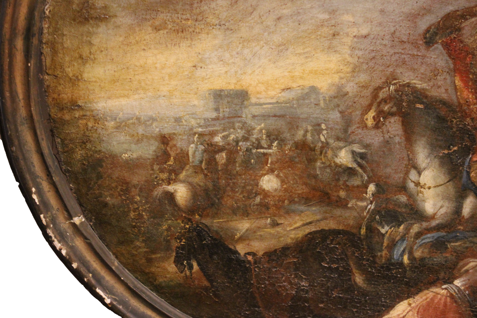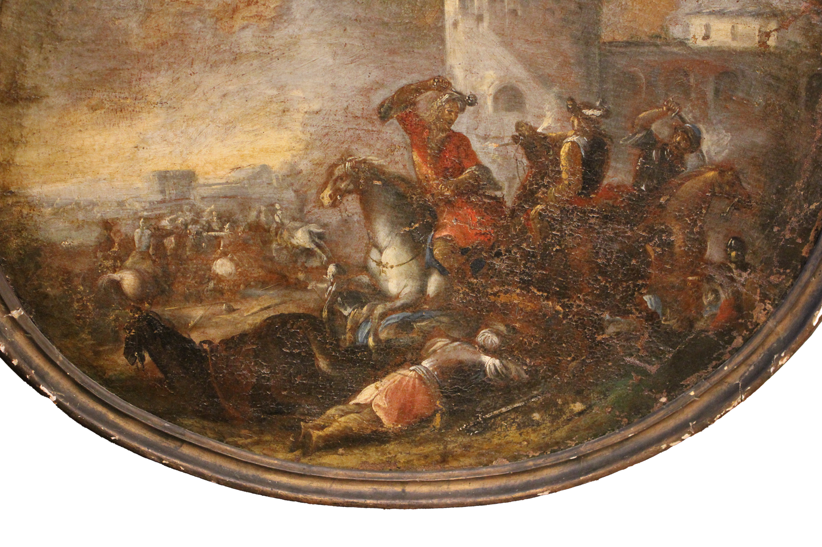 Une composition ovale saisissante, typique de l'école européenne, réalisée à l'huile sur toile, représentant une scène de bataille avec des chevaliers et des soldats au pied d'une forteresse. L'artiste fait preuve d'une grande maîtrise en rendant le mouvement des chevaux et l'intensité du combat grâce à des coups de pinceau fluides et dynamiques et à un usage subtil de la lumière, qui accentue la profondeur de l'atmosphère et les contrastes entre les figures au premier plan et le paysage à l'arrière-plan.