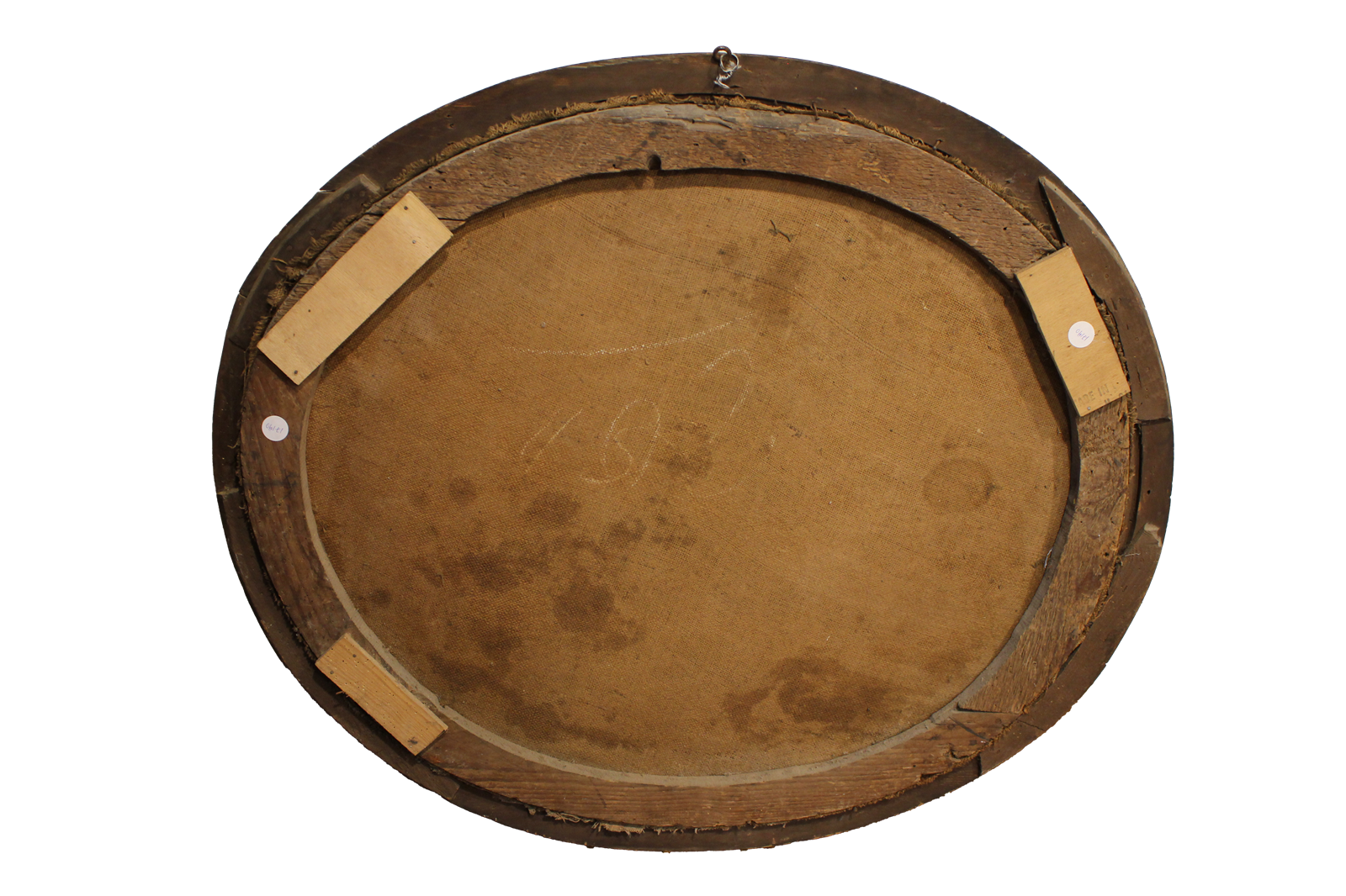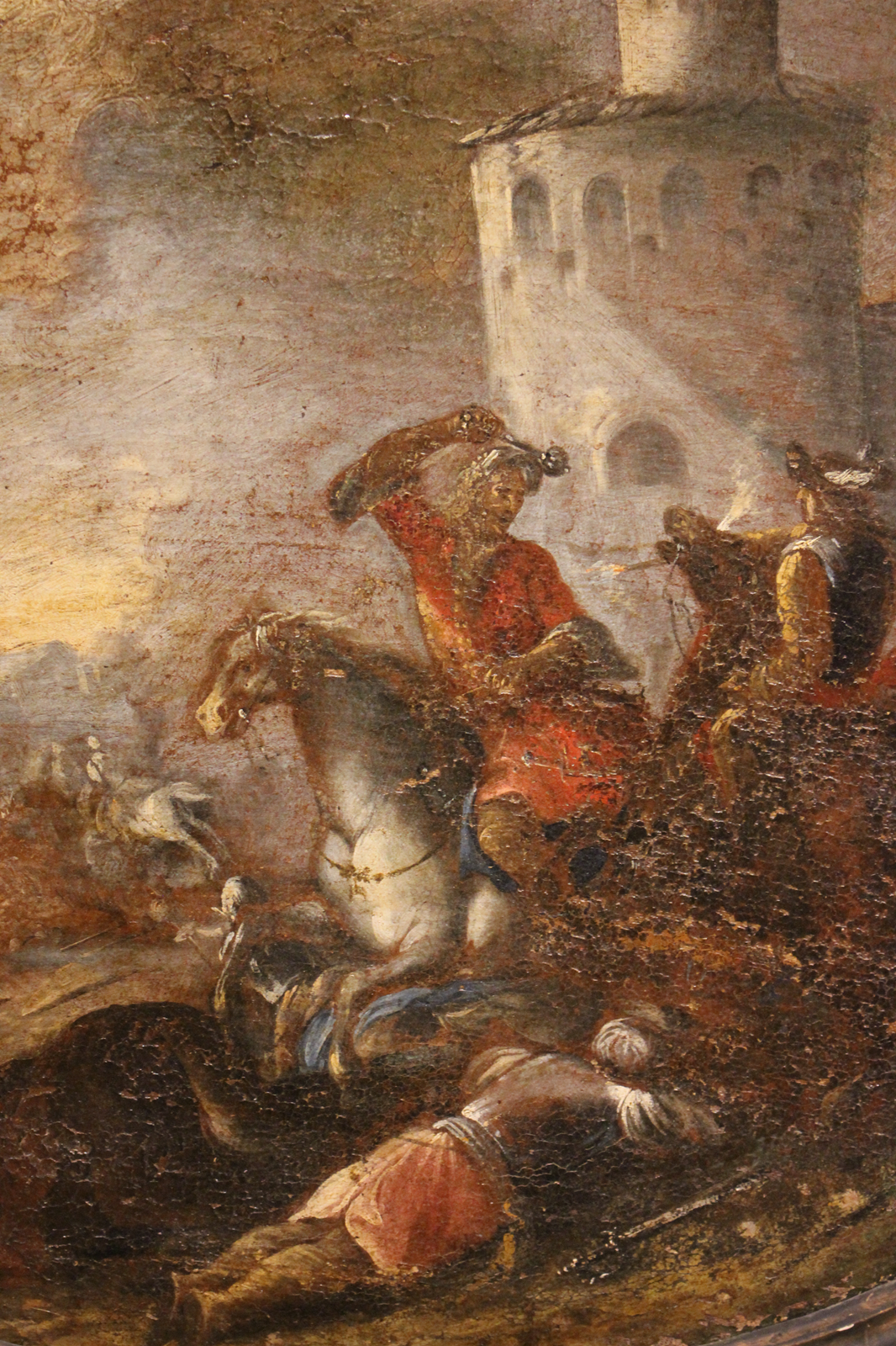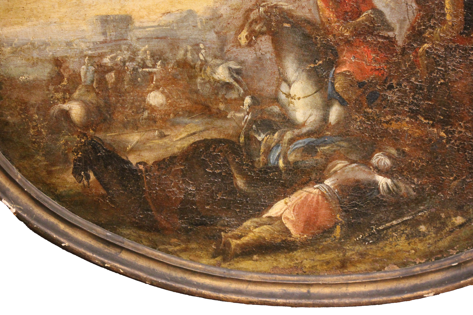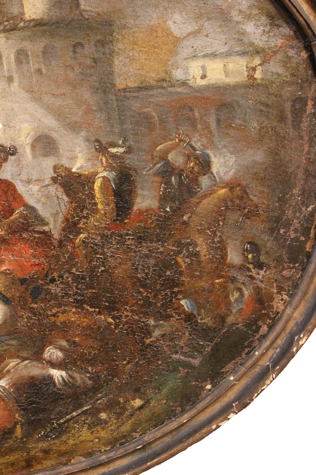 Une composition ovale saisissante, typique de l'école européenne, réalisée à l'huile sur toile, représentant une scène de bataille avec des chevaliers et des soldats au pied d'une forteresse. L'artiste fait preuve d'une grande maîtrise en rendant le mouvement des chevaux et l'intensité du combat grâce à des coups de pinceau fluides et dynamiques et à un usage subtil de la lumière, qui accentue la profondeur de l'atmosphère et les contrastes entre les figures au premier plan et le paysage à l'arrière-plan.