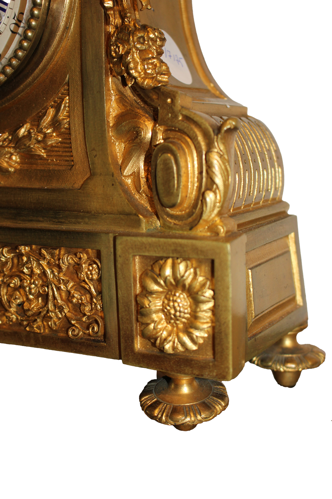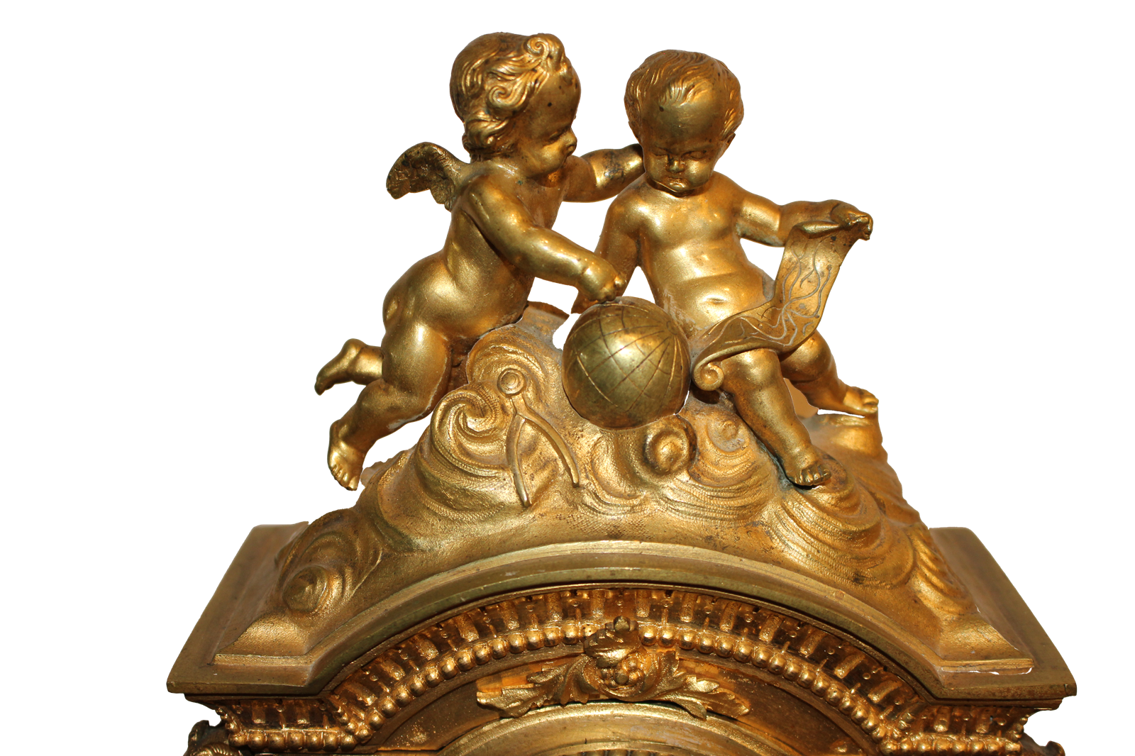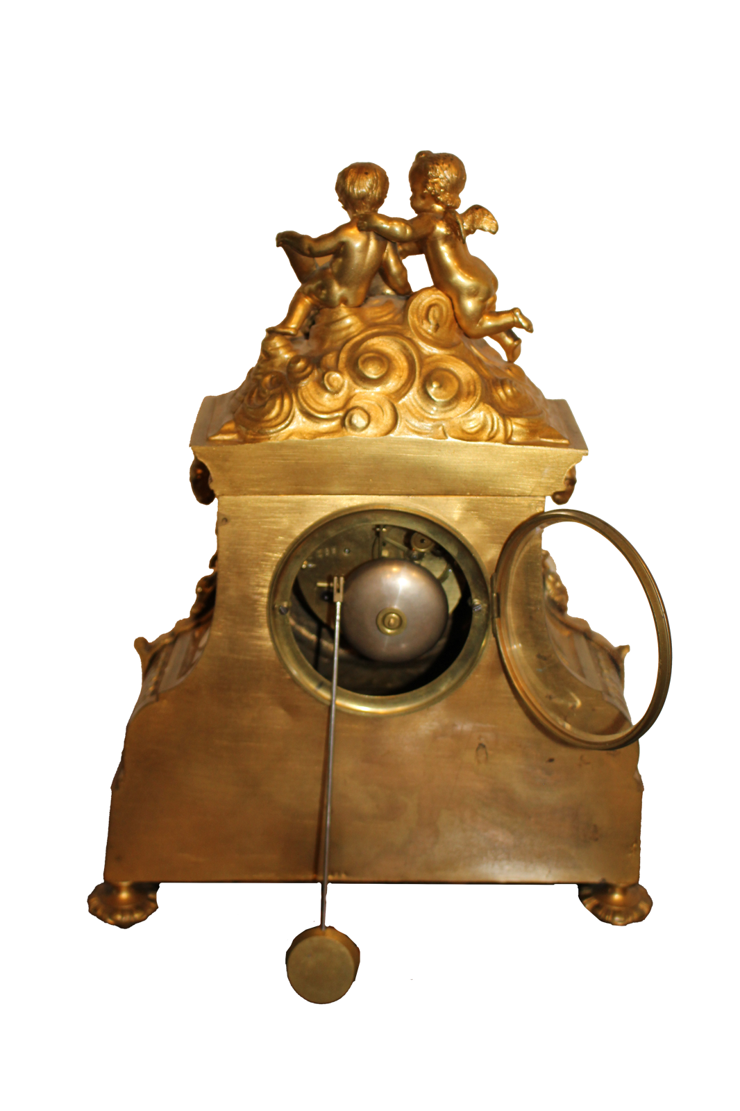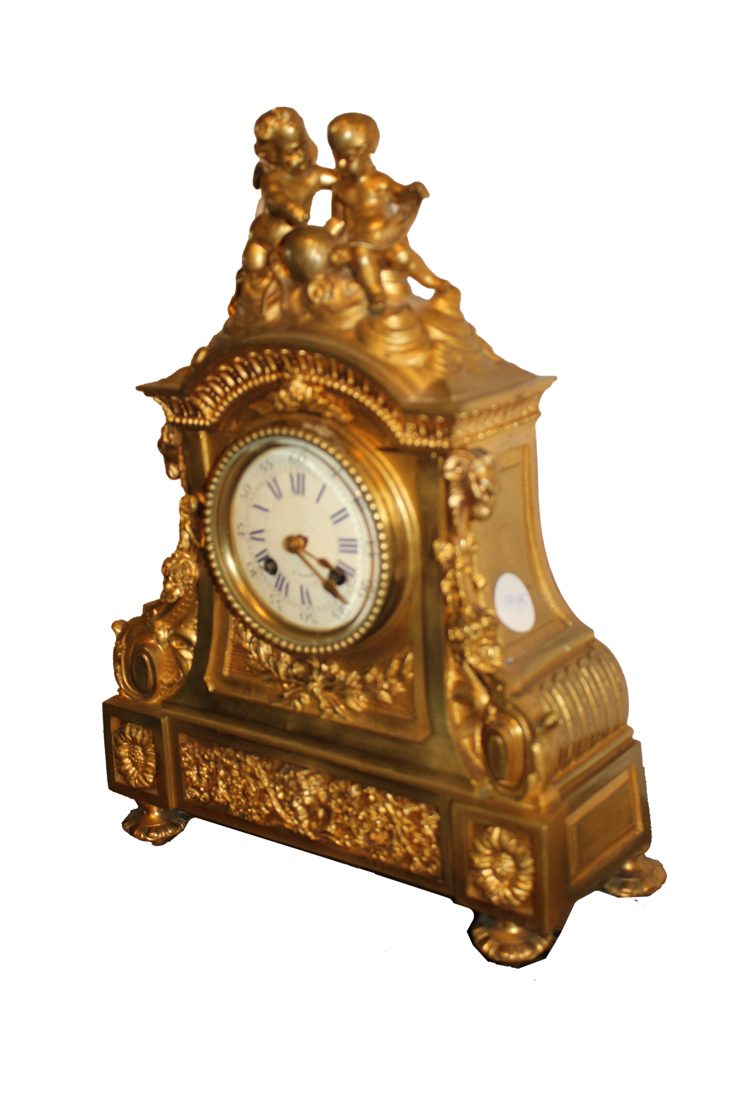Une pendule parisienne en bronze doré richement décorée, de style Louis XIV, ornée de motifs floraux et surmontée de deux chérubins. Son cadran est constitué d'une plaque de porcelaine.