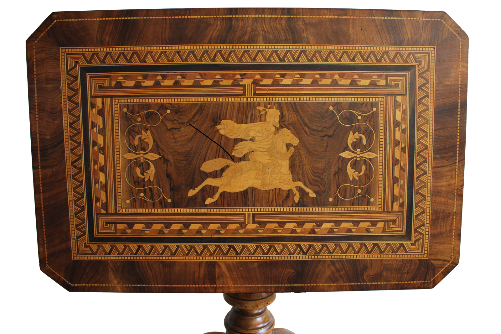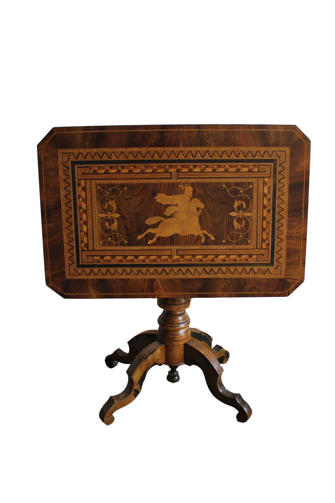 Splendide table basse Sorrento de fabrication italienne, réalisée en noyer fin et ornée d'une marqueterie raffinée, exécutée avec une maîtrise exceptionnelle. Son plateau rectangulaire, orné d'un élégant motif floral et d'une scène centrale représentant un chevalier à cheval, est un excellent exemple de l'ébénisterie sorrento-napolitaine du XIXe siècle. Son piètement tourné et sculpté présente un élégant tronc central se ramifiant en quatre pieds galbés, également finement marquetés.