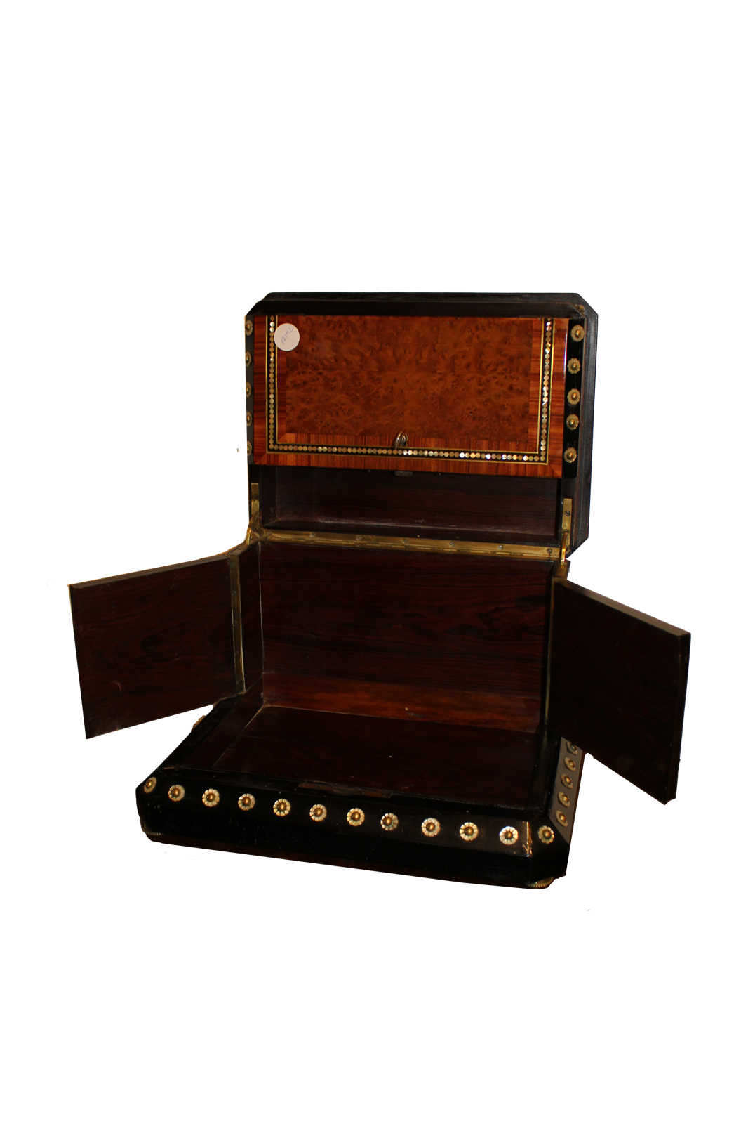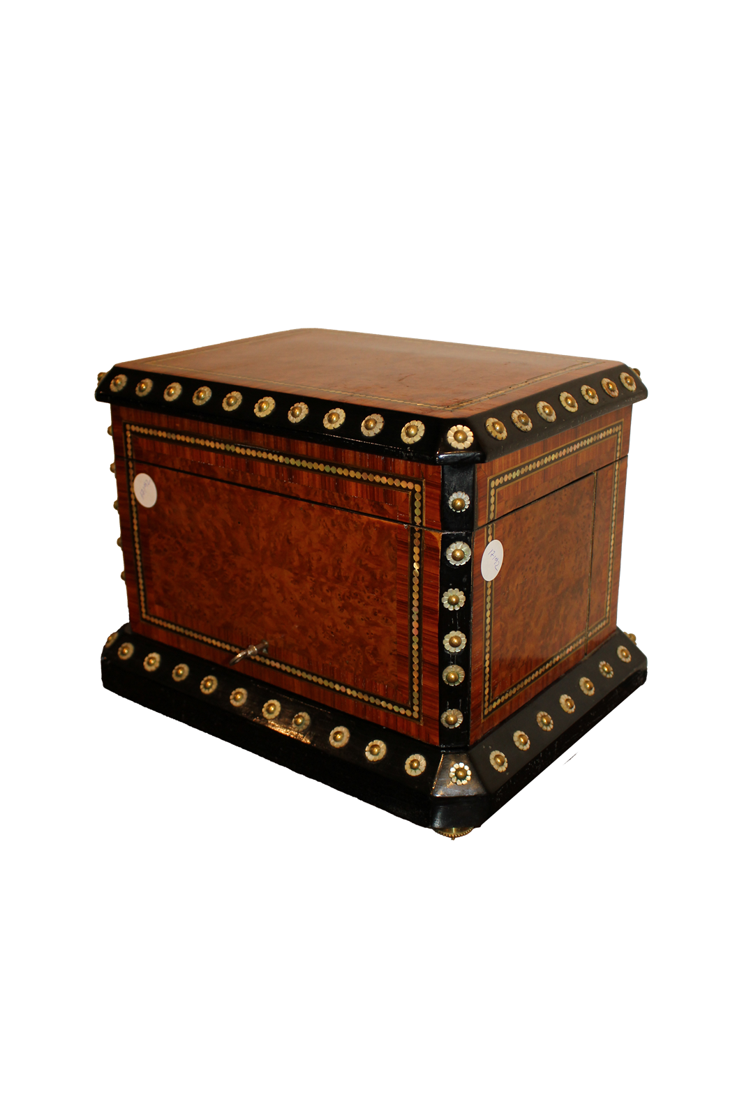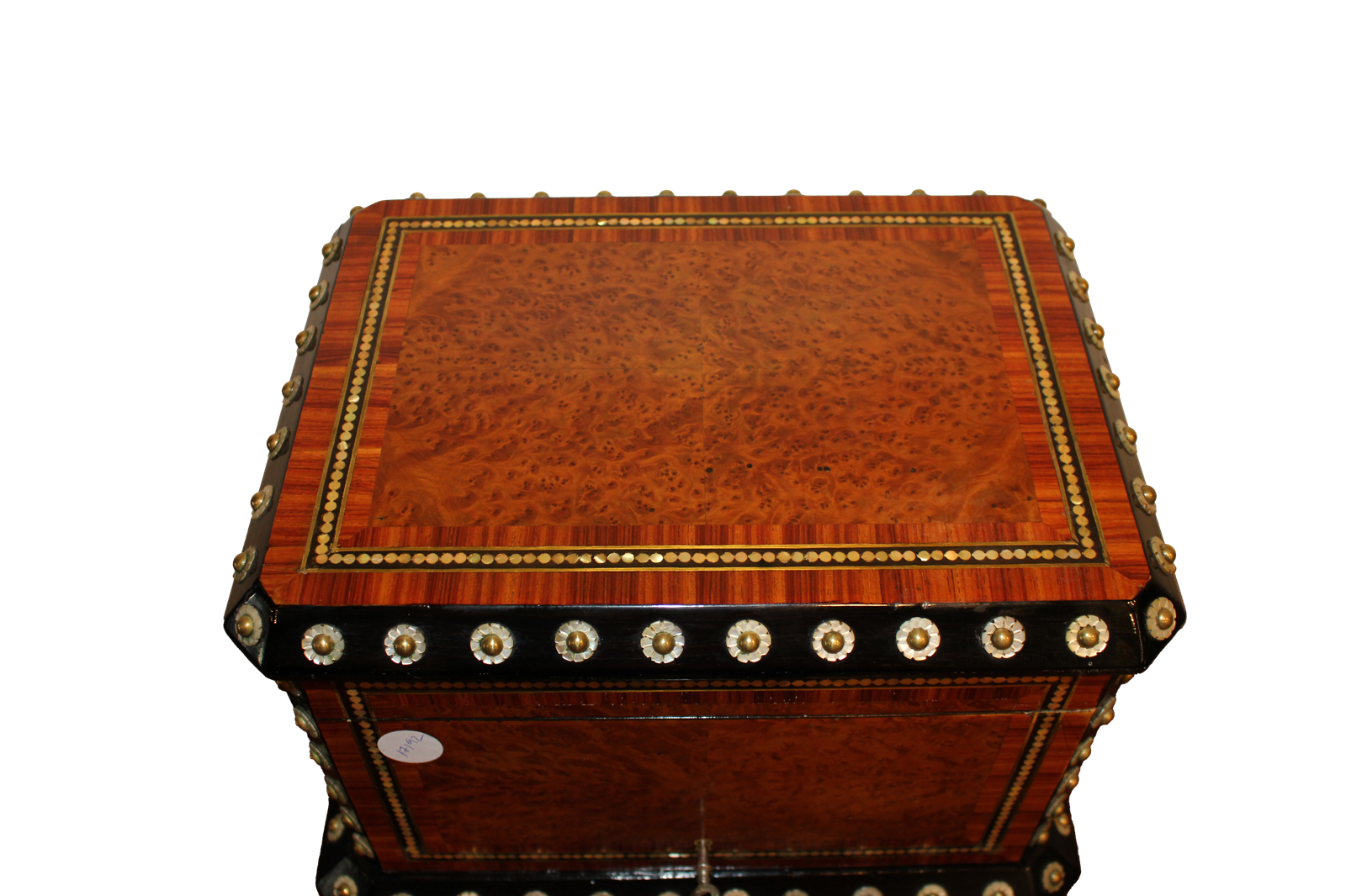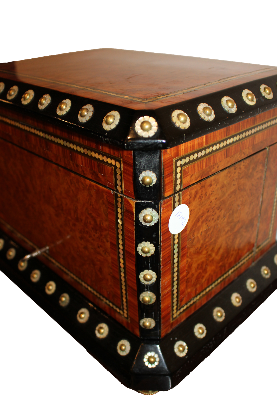 Magnifique coffret à liqueur de style Napoléon III, réalisé en palissandre, loupe d'érable et roses en nacre serties dans du bois ébénisé.