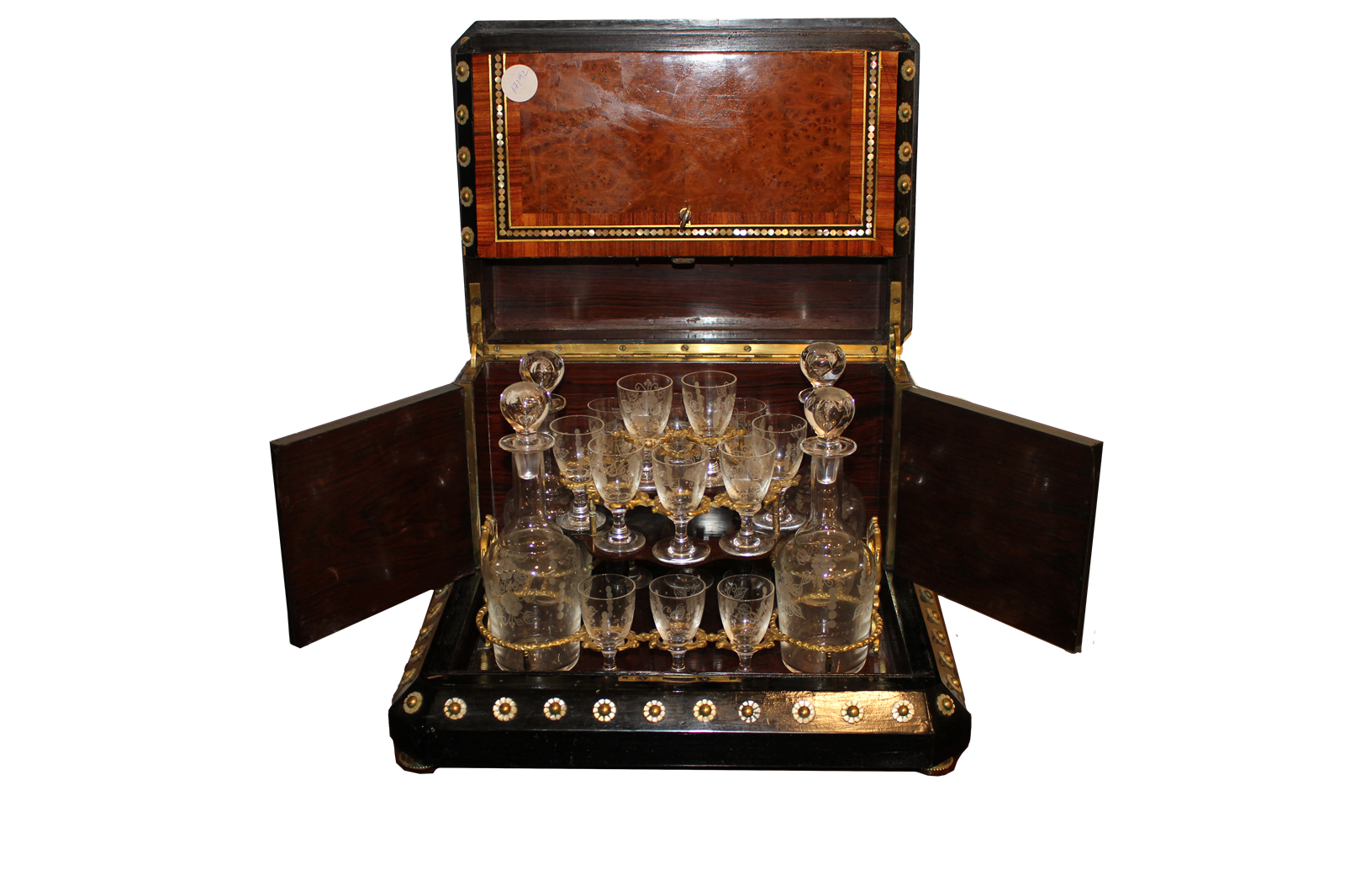 L'intérieur est complété par 13 verres et 4 bouteilles en cristal finement ouvragé.