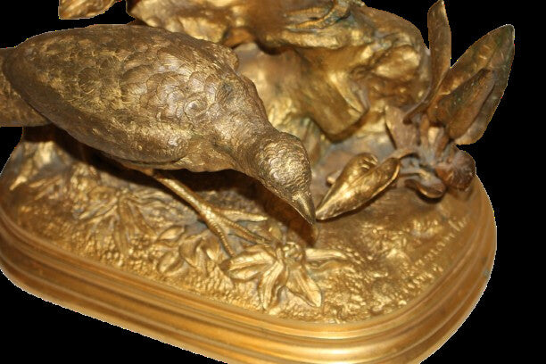 Élégante sculpture française de la fin du XIXᵉ siècle, représentant des paons, symboles de beauté et de raffinement. Réalisée en métal doré, l’œuvre reflète le raffiné style Art Nouveau (Liberty), caractérisé par des lignes fluides, un mouvement harmonieux et des détails décoratifs riches, typiques de la production artistique française de l’époque.
