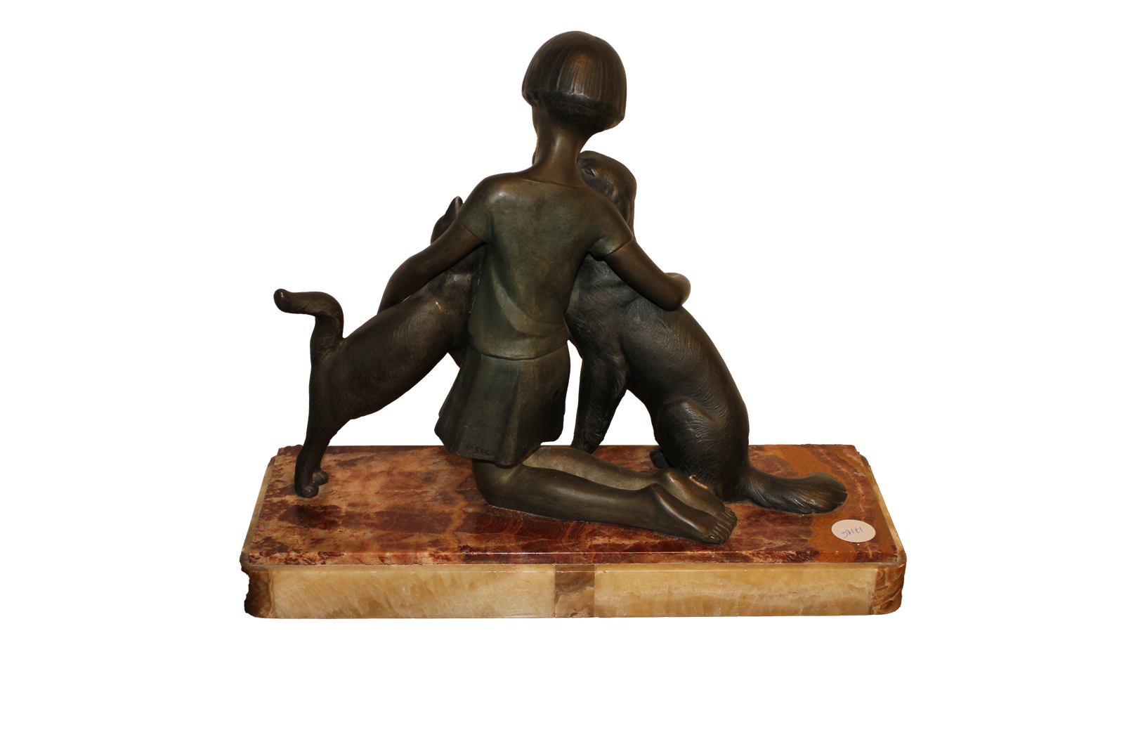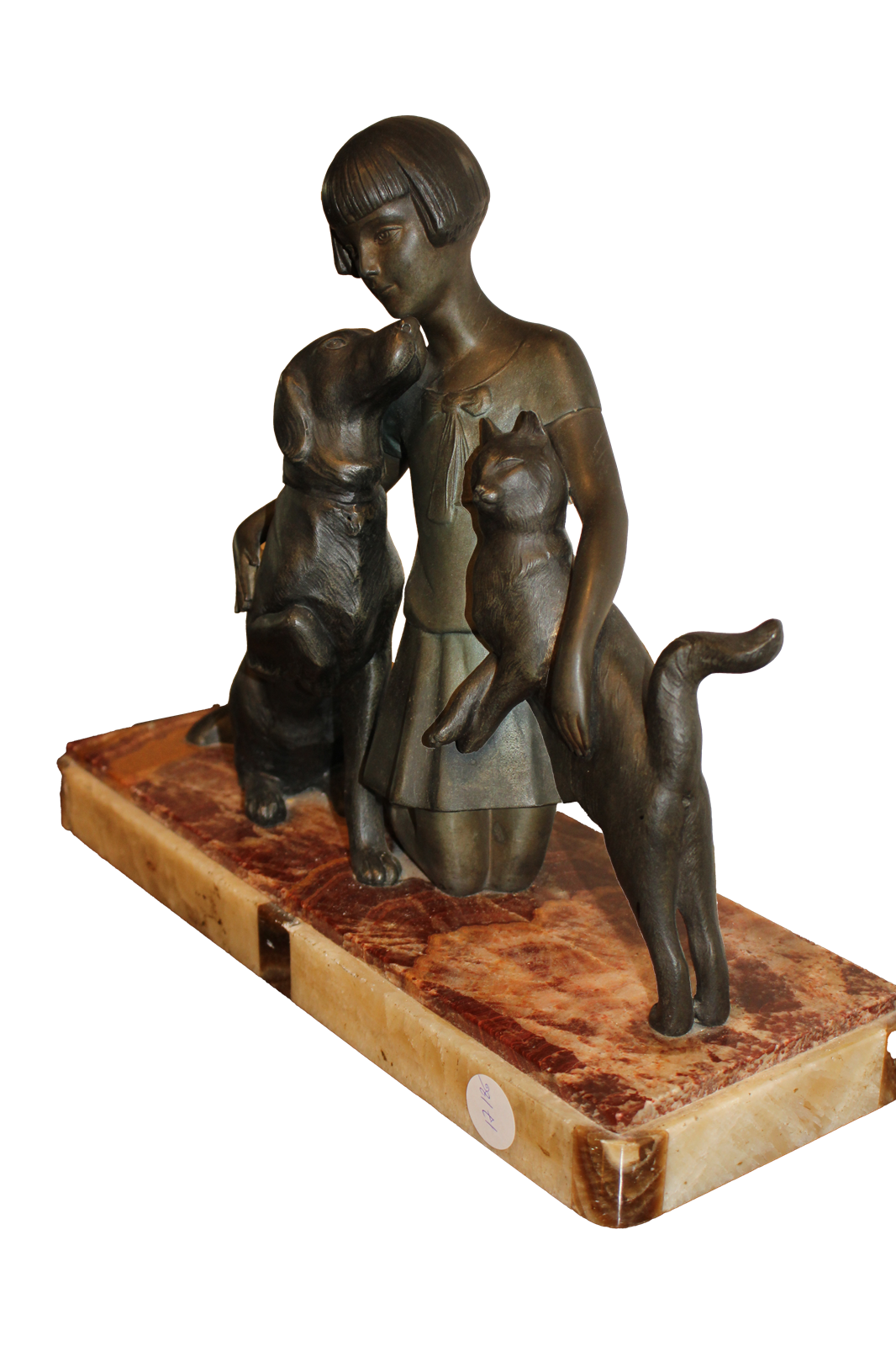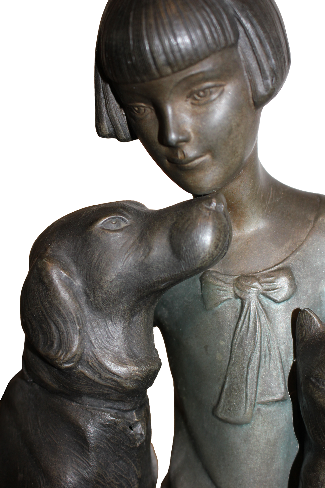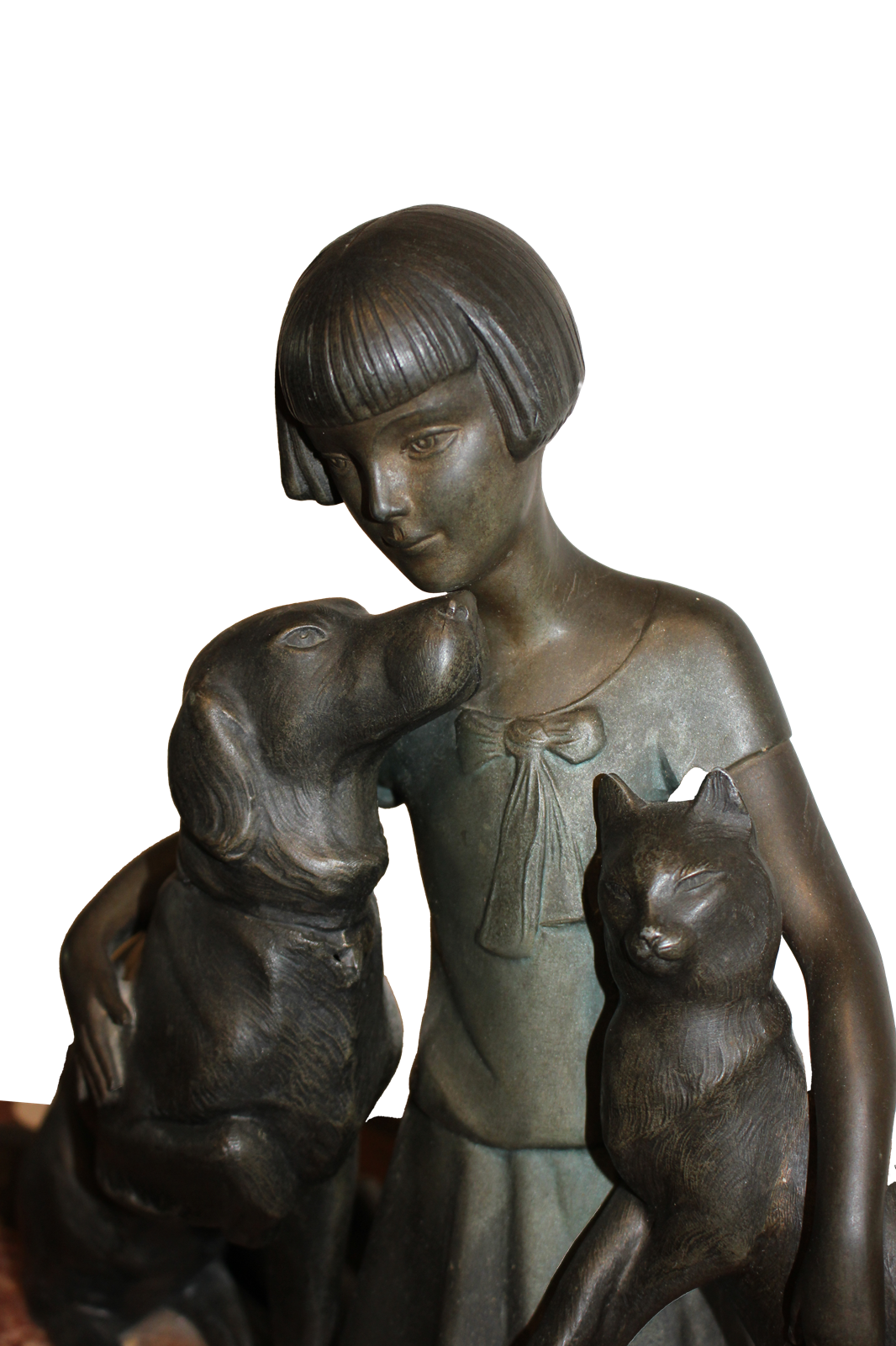 Sculpture Art déco française représentant une jeune fille avec un chien et un chat, signée P. Sega - XXe siècle