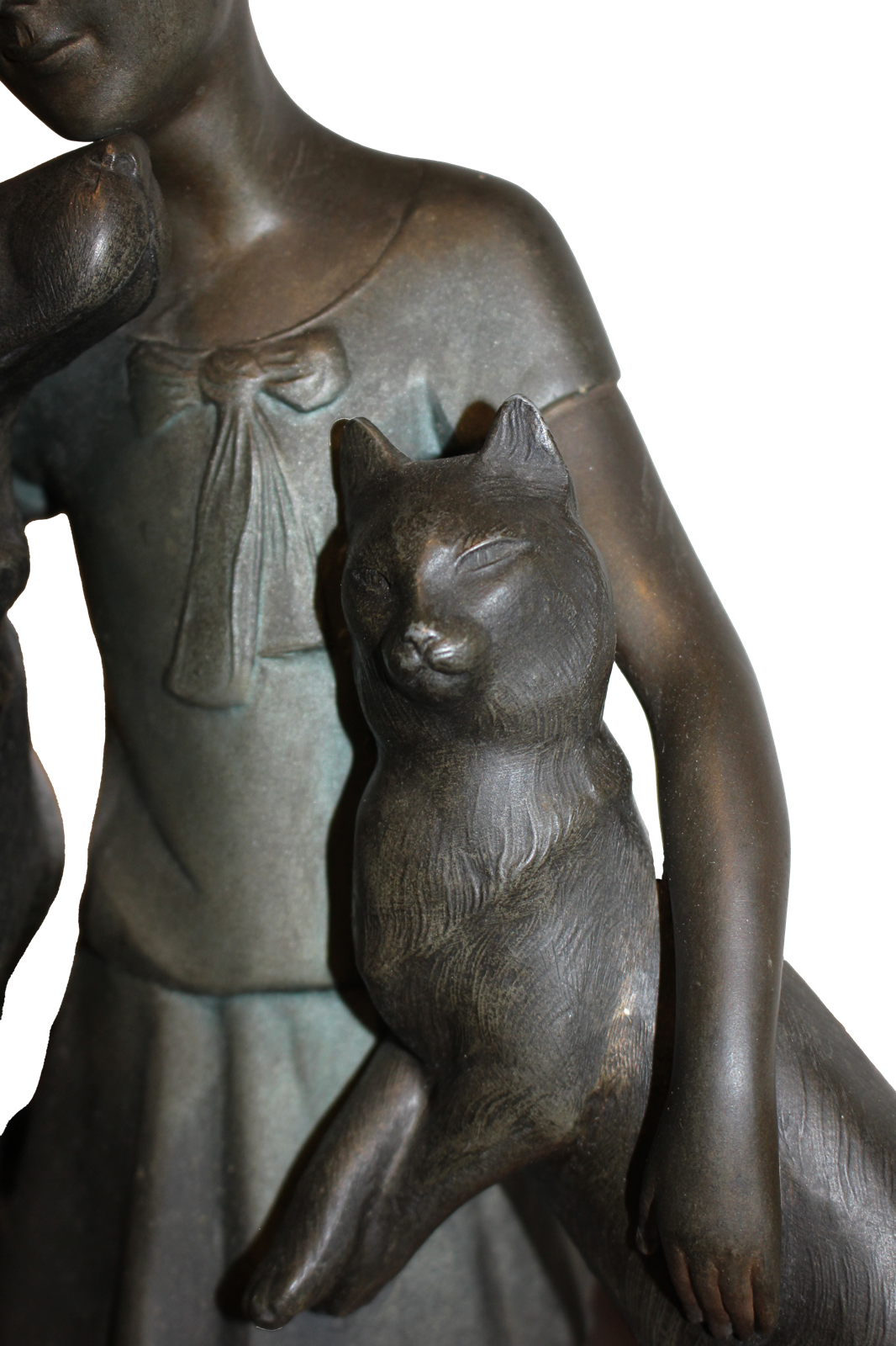 L'œuvre représente une jeune fille gracieuse accompagnée d'un chien et d'un chat, dans un style raffiné et harmonieux, caractéristique de l'Art déco. Le bronze, finement ciselé et patiné, met en valeur les détails des visages et les mouvements des personnages.