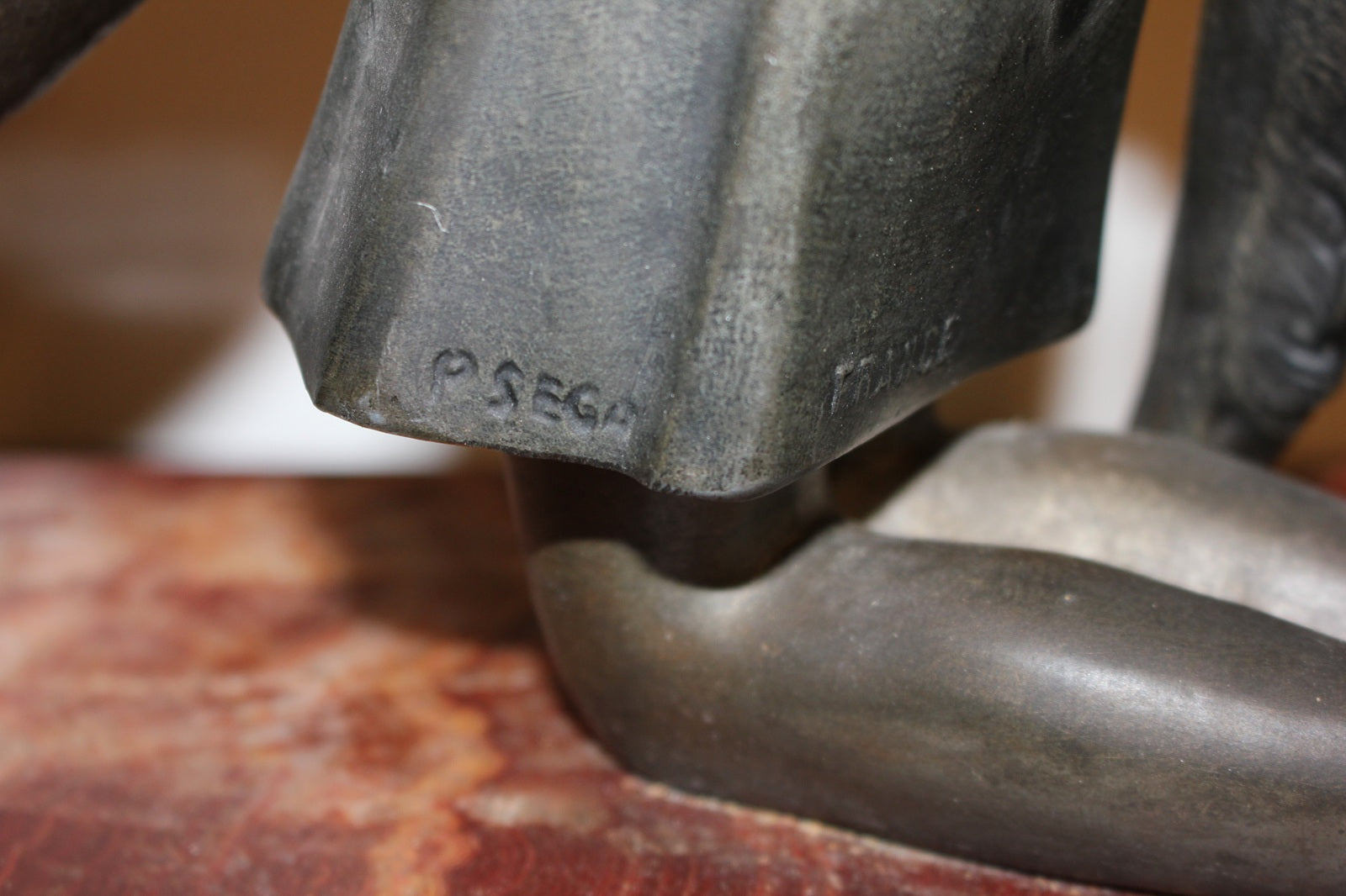 La sculpture est signée « P. Sega », un artiste connu pour ses représentations féminines dynamiques et d'une grande élégance.