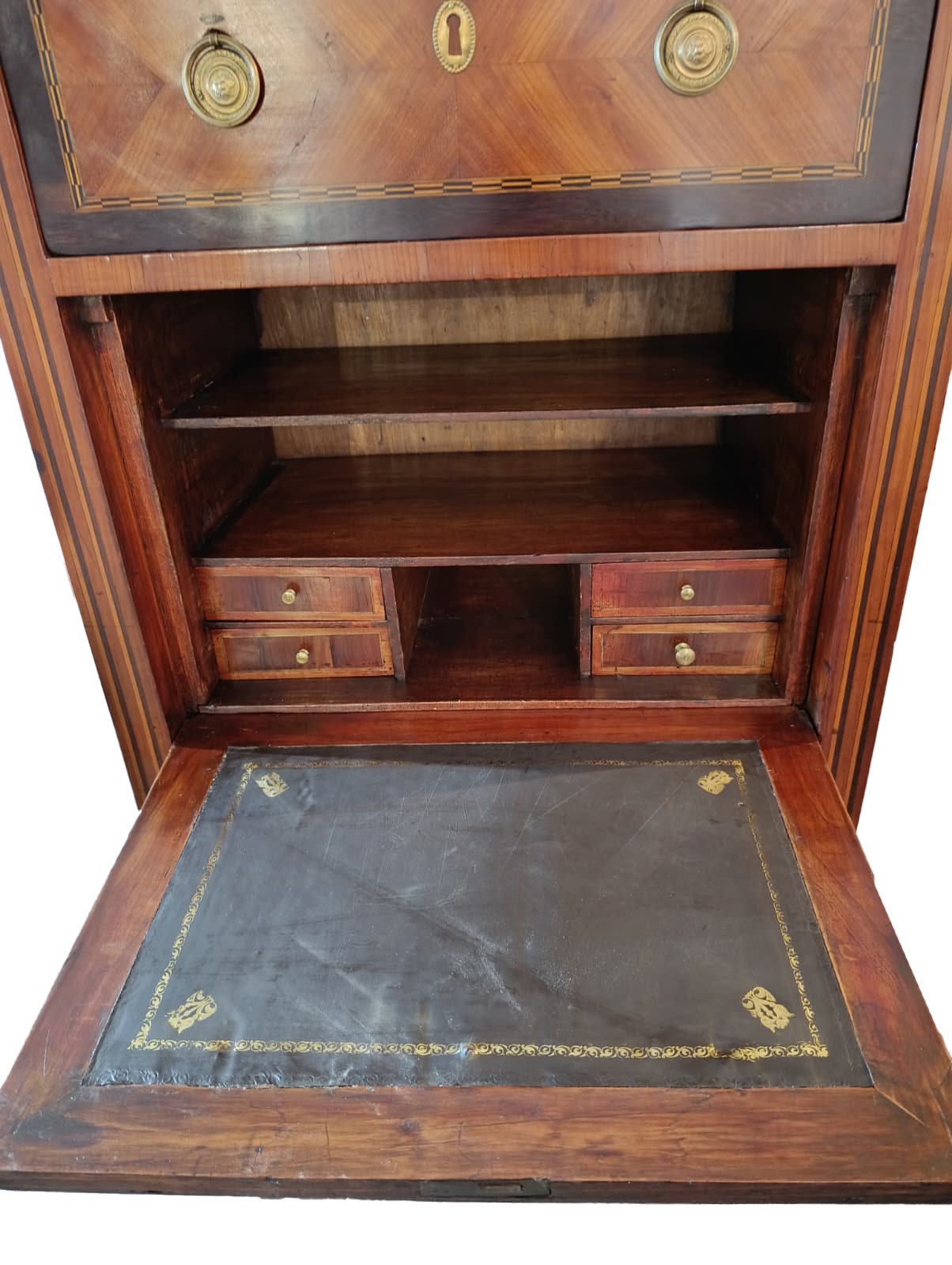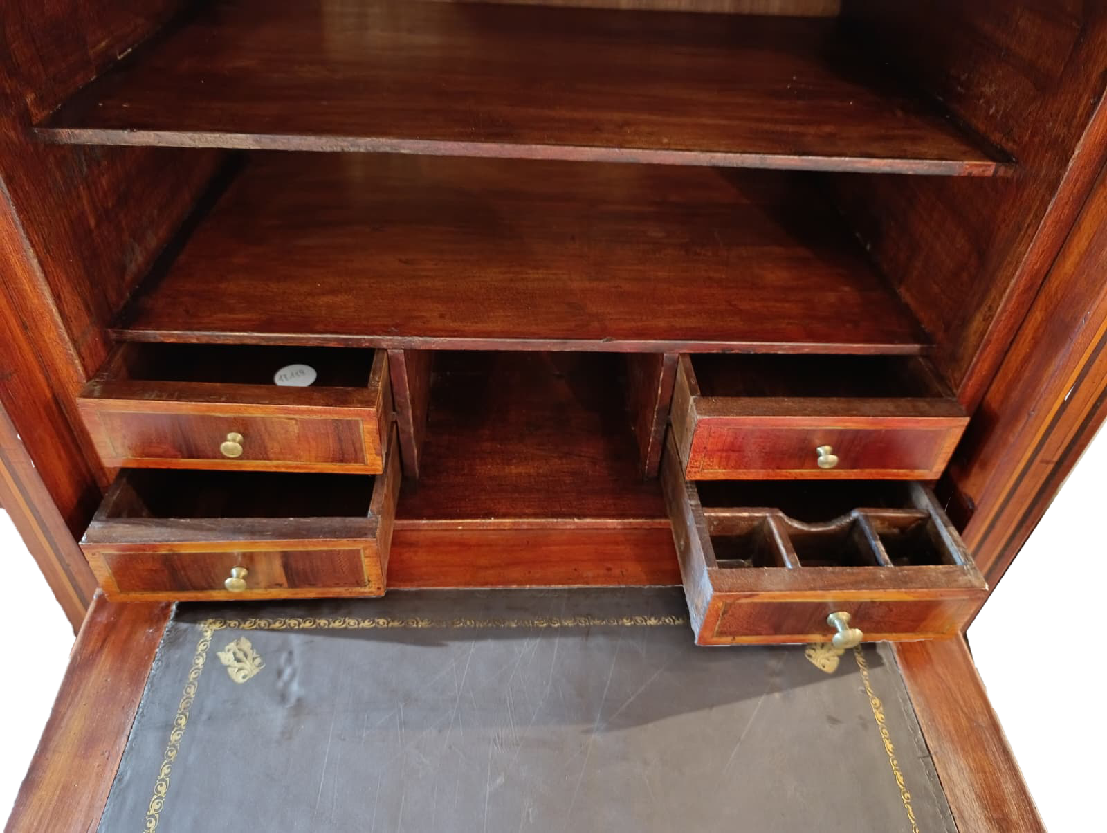L'intérieur, finement fini, abrite des compartiments et des petits tiroirs, conservant la disposition typique des bureaux de l'époque.