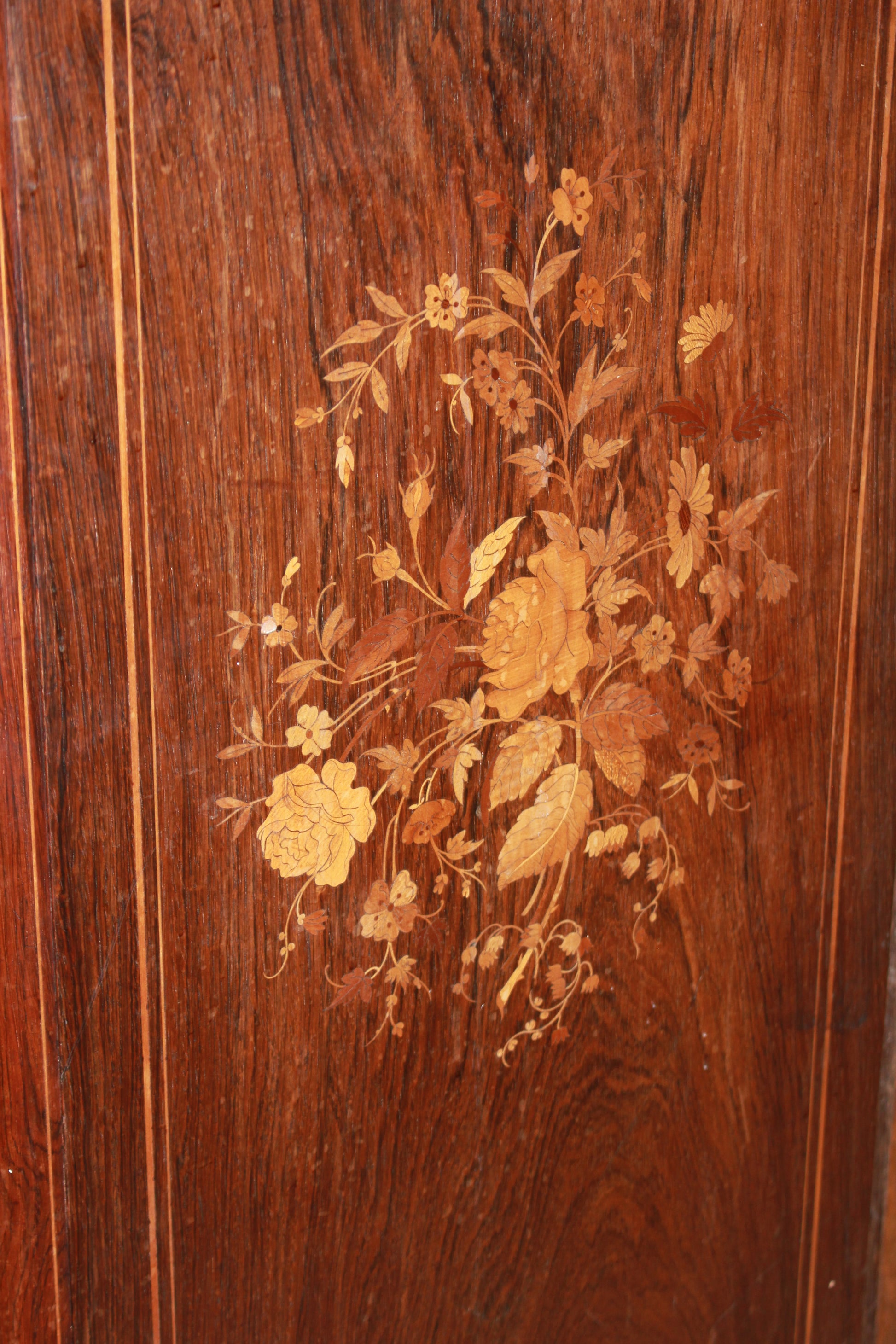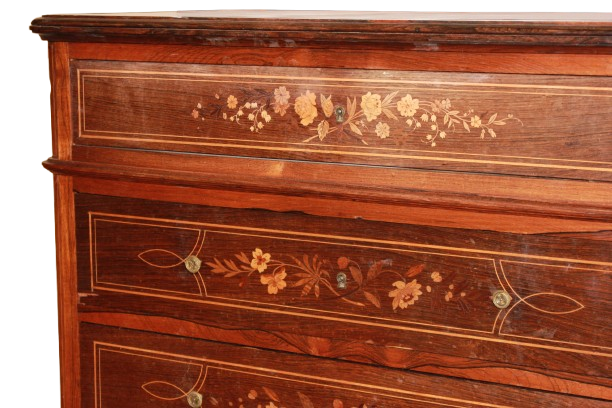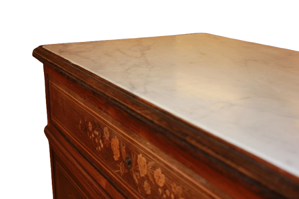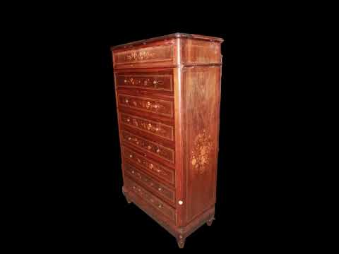 L’ensemble des tiroirs est enrichi de riches décors en marqueterie, tandis que les côtés sont ornés de motifs floraux finement marquetés, témoignant d’un remarquable savoir-faire artisanal.