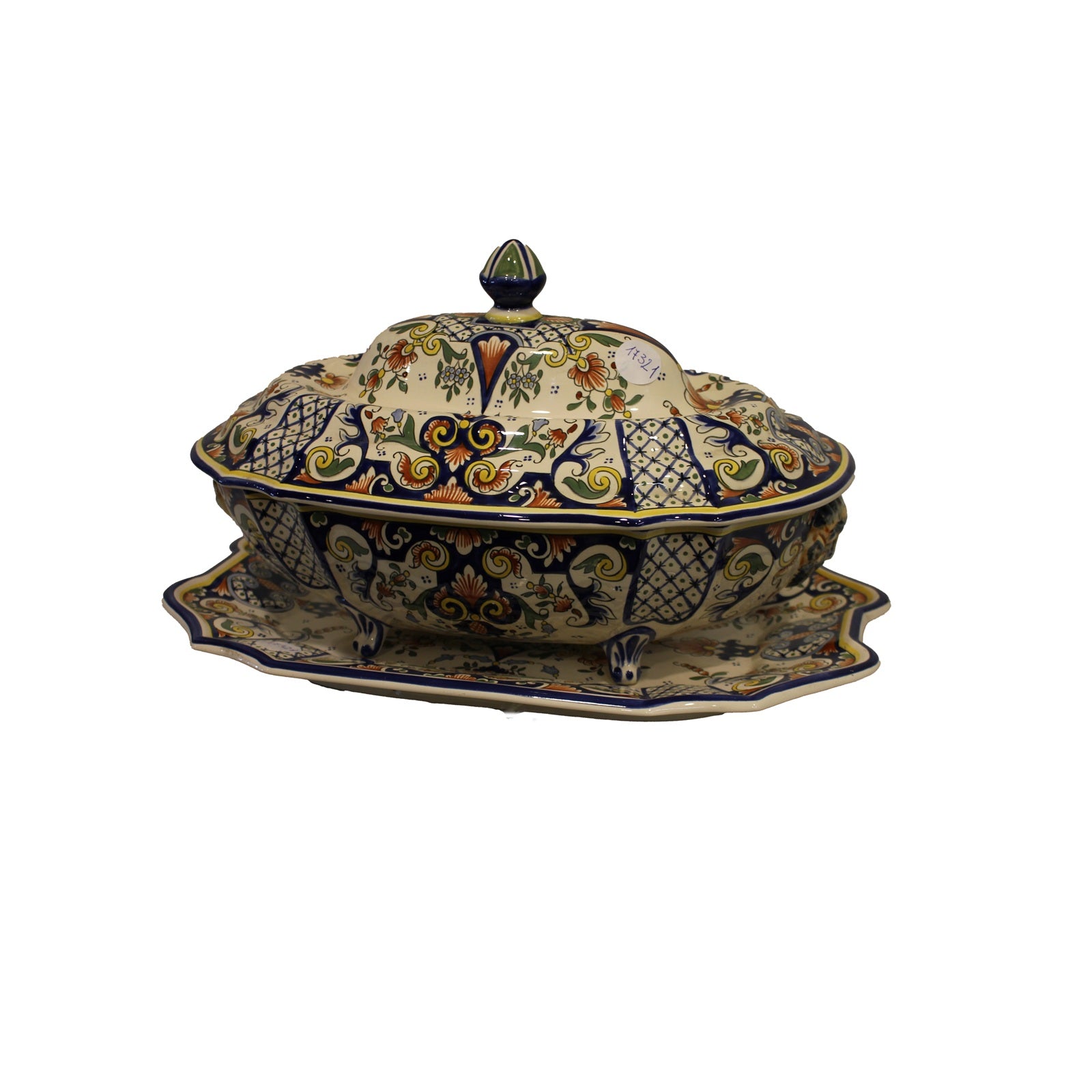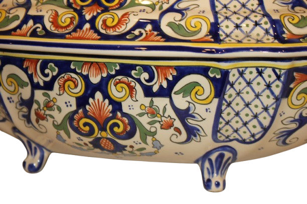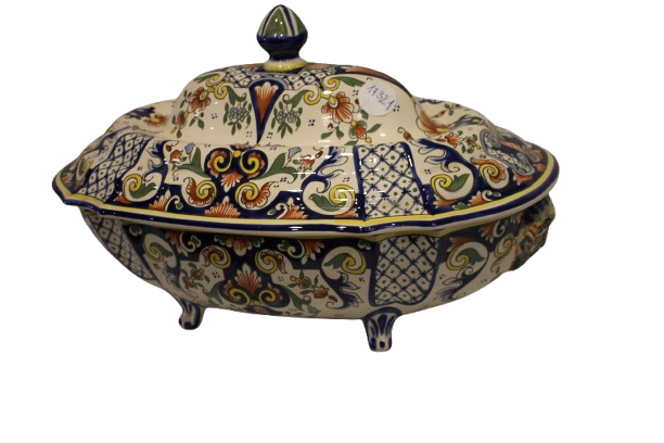Soupière française en porcelaine avec présentoir – Début XXᵉ siècle, décor riche sur fond blanc