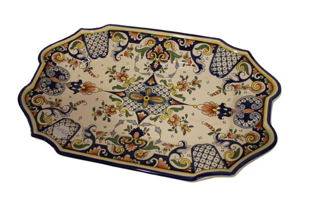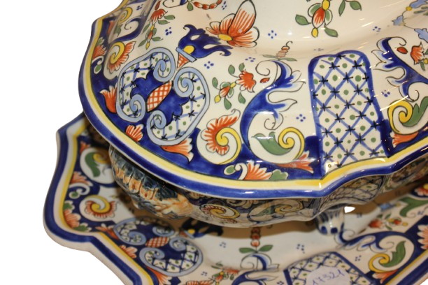 Magnifique soupière française avec son plateau assorti, datant du début du XXᵉ siècle, réalisée en porcelaine fine et richement décorée sur fond blanc.
