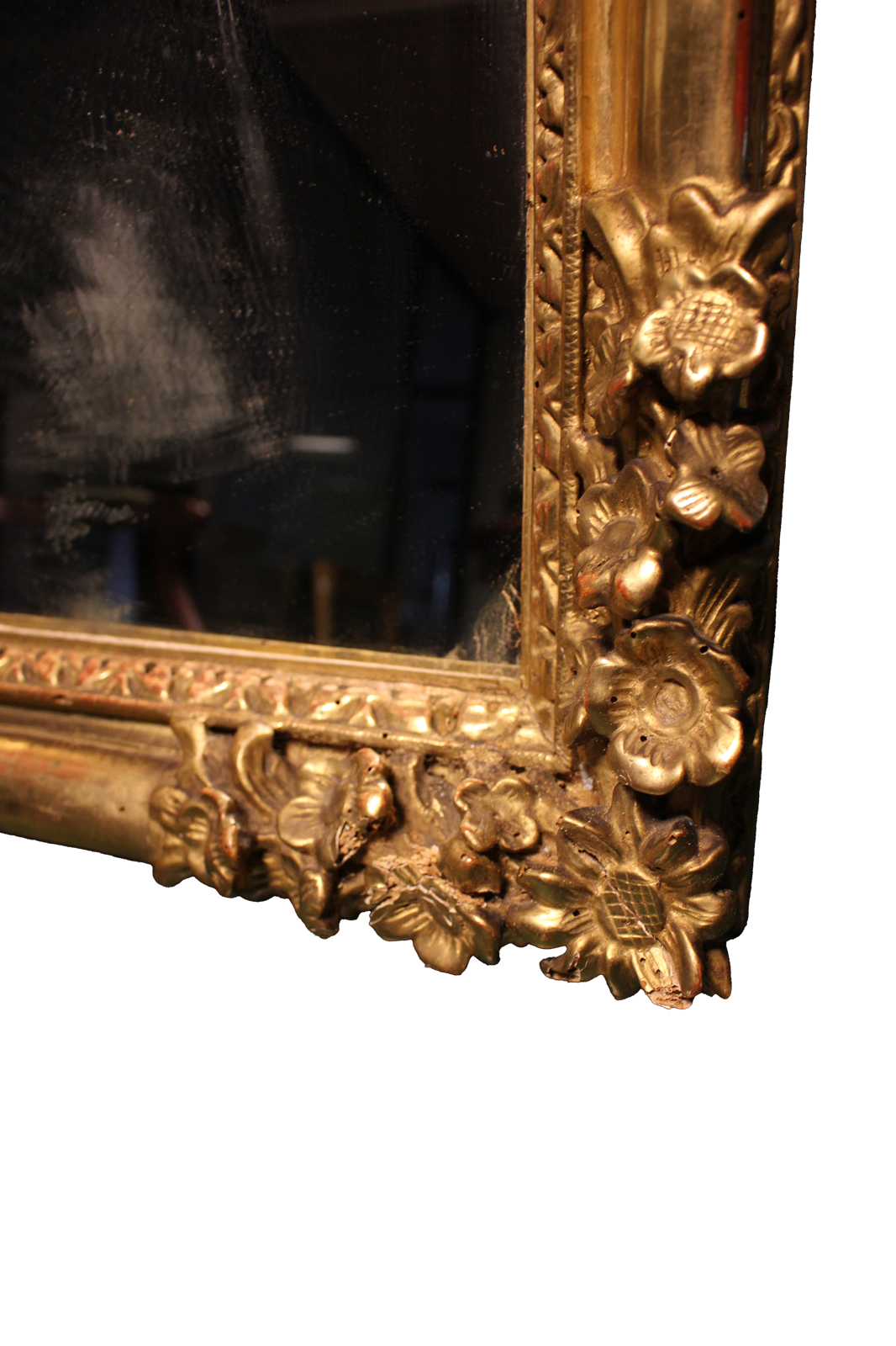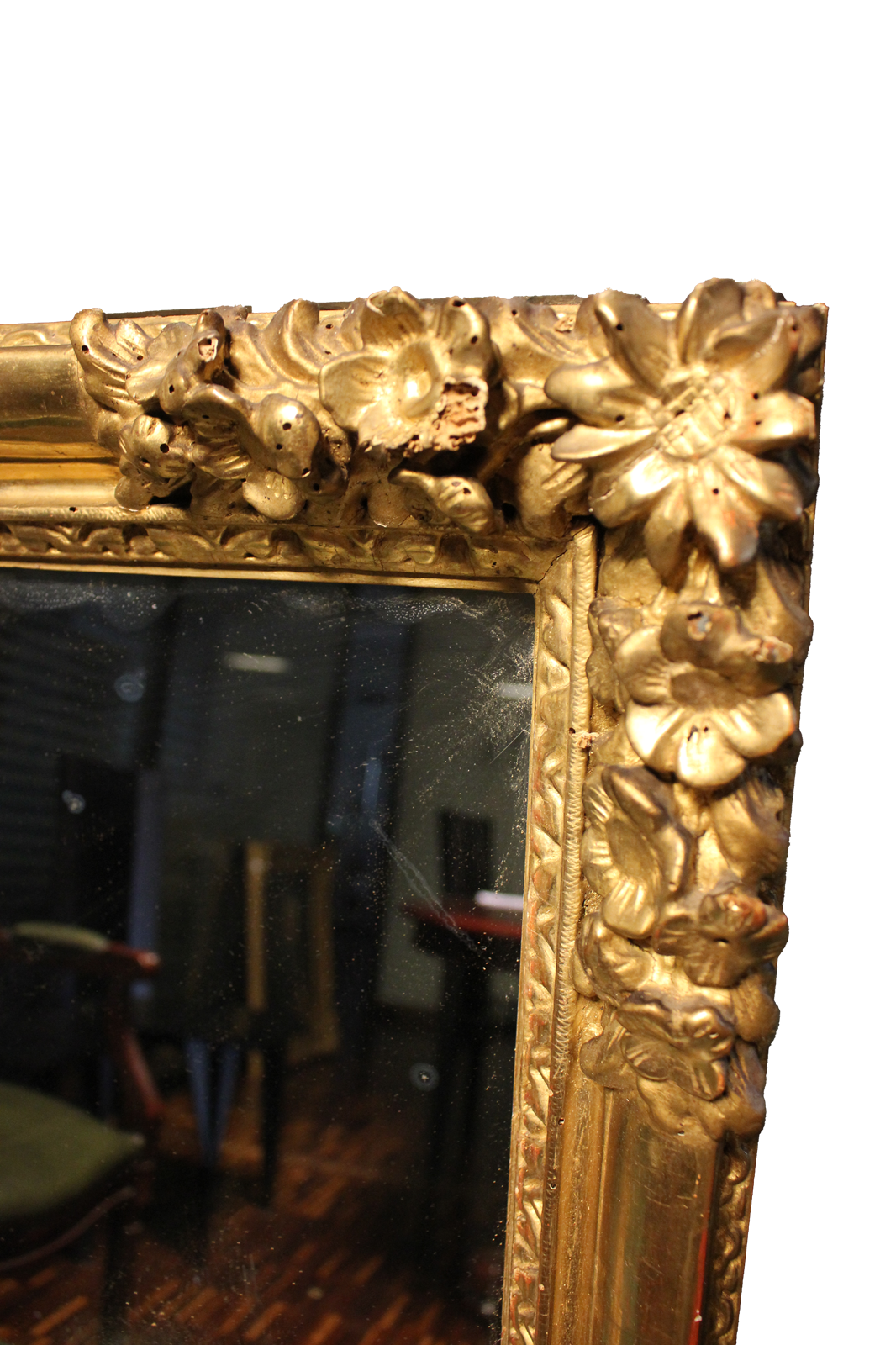 Ce splendide miroir ancien présente un cadre en bois richement sculpté, orné de délicats motifs floraux, de volutes et de rosaces. La dorure, encore lumineuse et chaleureuse, confère à la pièce une élégance saisissante, caractéristique du savoir-faire d'exception du XIXe siècle.