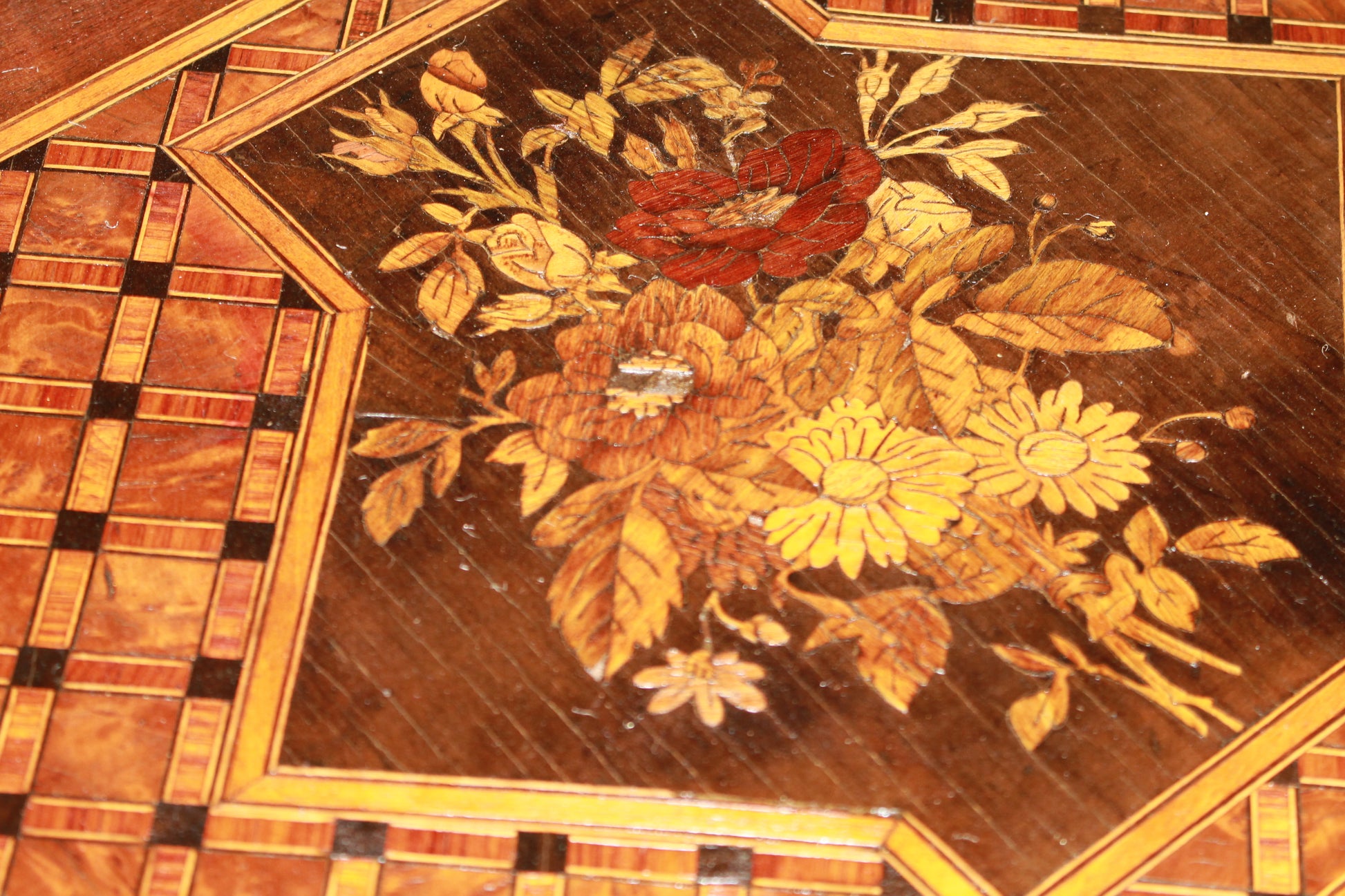 Elle présente un riche marqueterie florale sur le plateau central, un petit tiroir inférieur et des applications en métal doré, témoignant du savoir-faire décoratif typique de l’époque.