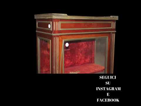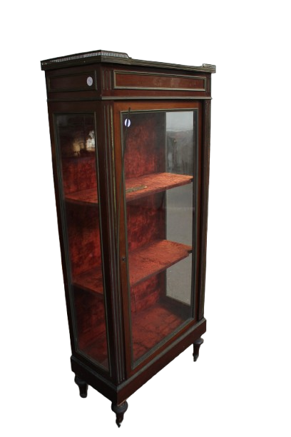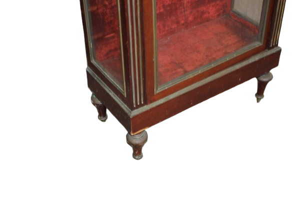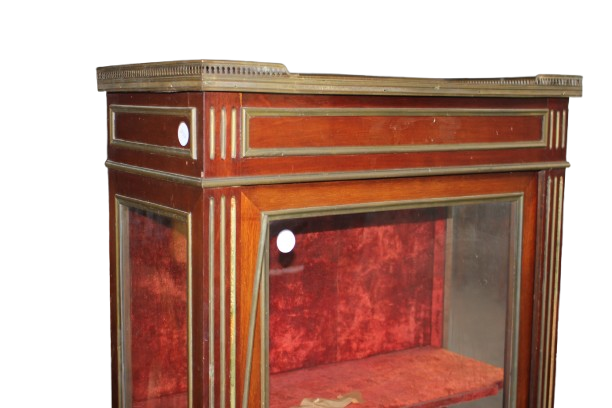 Élégante vitrine française de la seconde moitié du XIXe siècle, réalisée en acajou et de style Louis XVI. Elle présente une porte vitrée, un plateau en marbre Rouge de France ceinturé d’une délicate galerie en laiton, ainsi que de raffinés décors d’intarsia en laiton sur le corps du meuble. Meuble ancien de grande élégance, proposé avec restauration incluse.