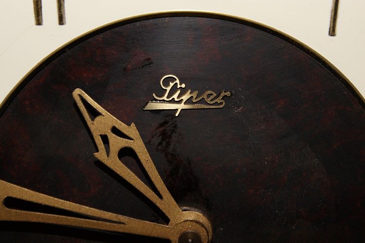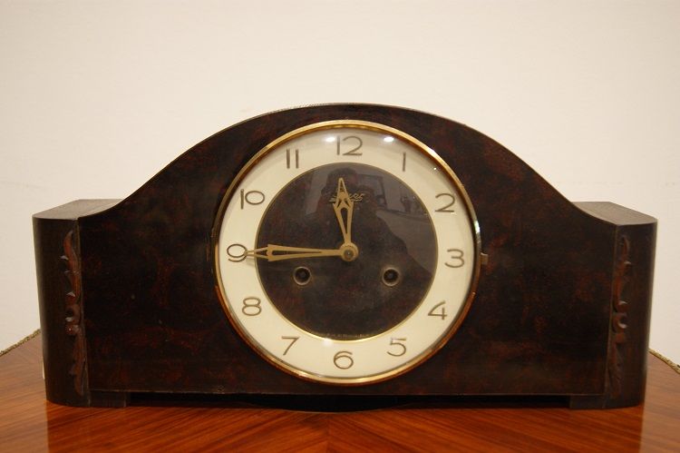 Orologio italiano stile Decò in legno di rovere con piccoli intagli sul fronte.