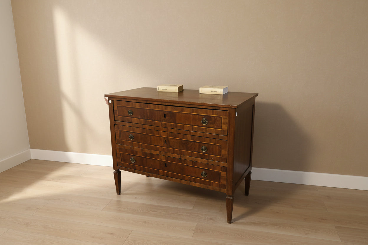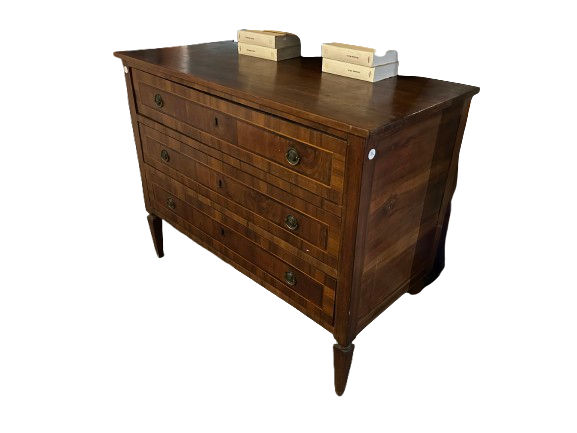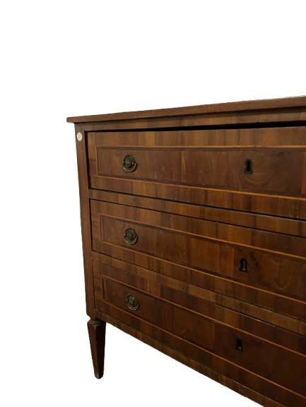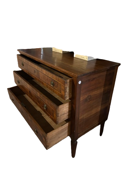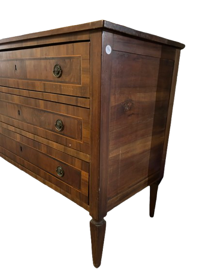 Cassettone italiano di inizio 1800 stile Luigi XVI in legno di noce. Presenta 3 cassetti impreziositi da filetto di intarsio maniglie in bronzo e piedini a piramide rovesciata.
