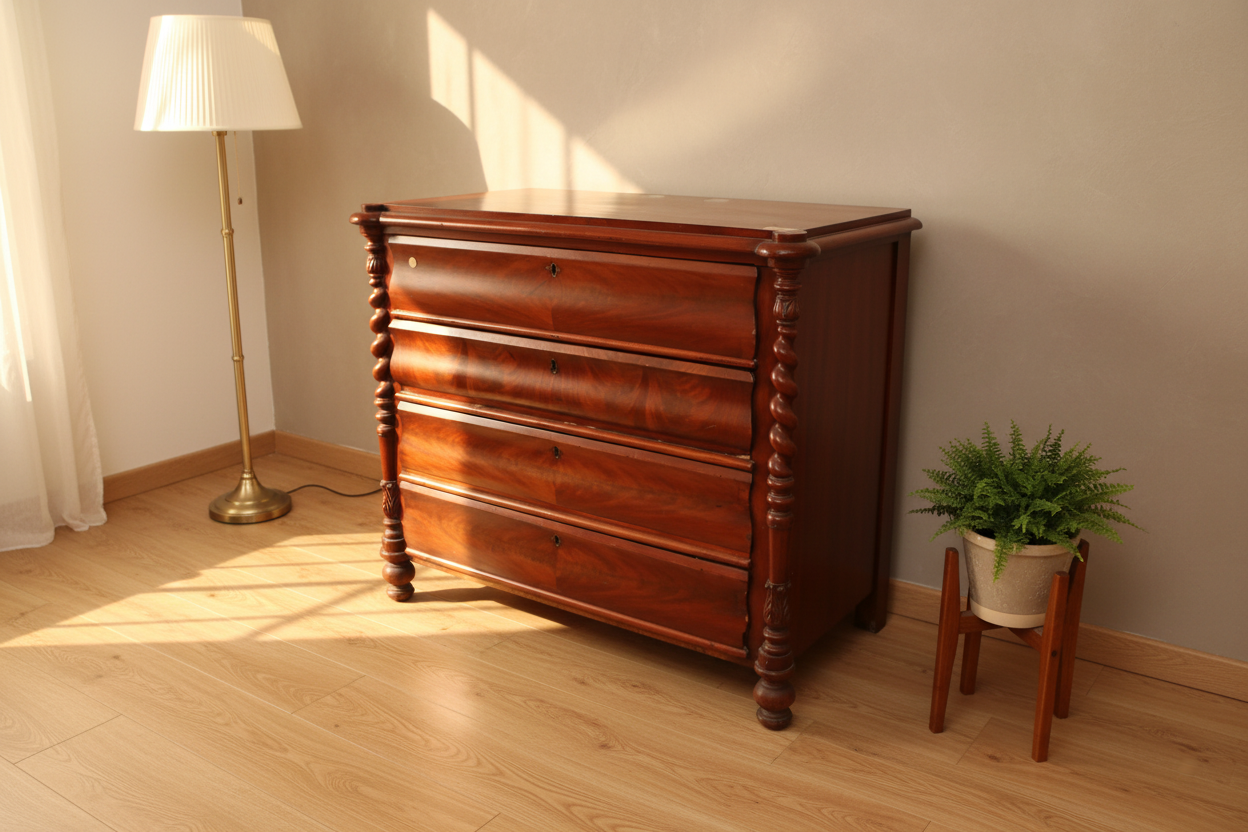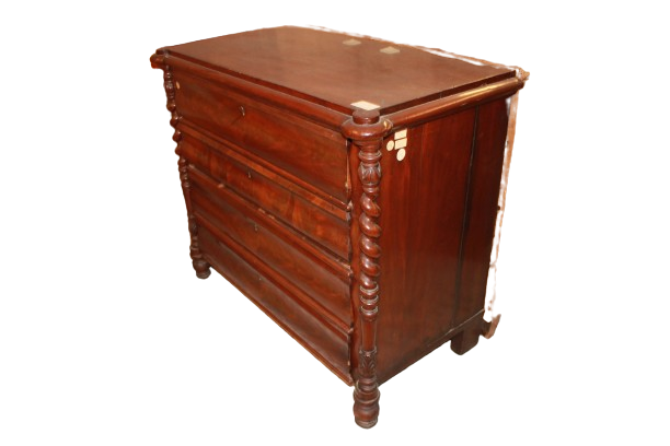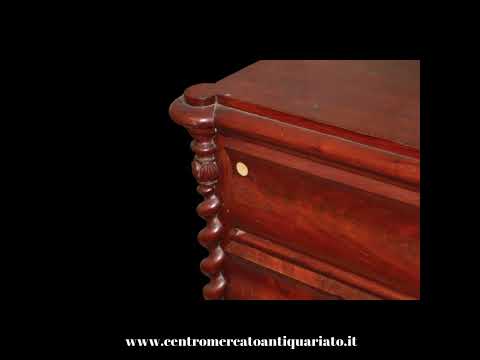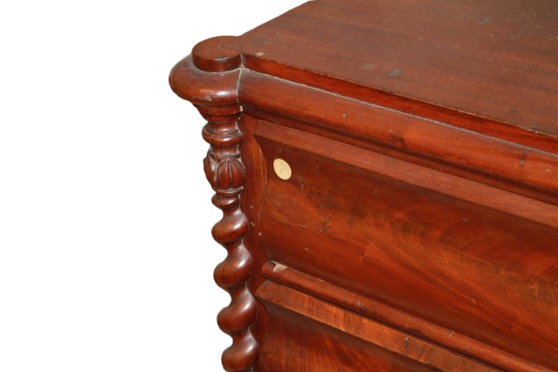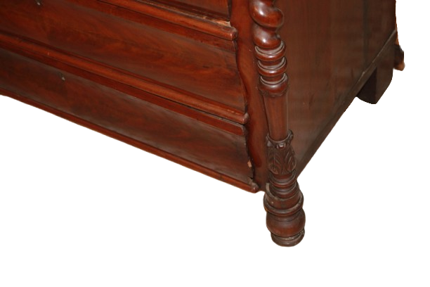 Piccolo cassettone Nord Europa di metà 1800 stile Biedermeier in legno di mogano e piuma di mogano. Presenta quattro ampi cassetti, e ai lati spiccano colonne tornite con andamento a spirale.