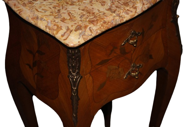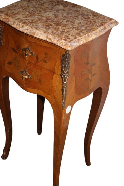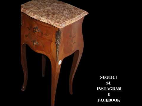 Coppia di comodini francesi stile Luigi XV intarsiati e con piano in marmo