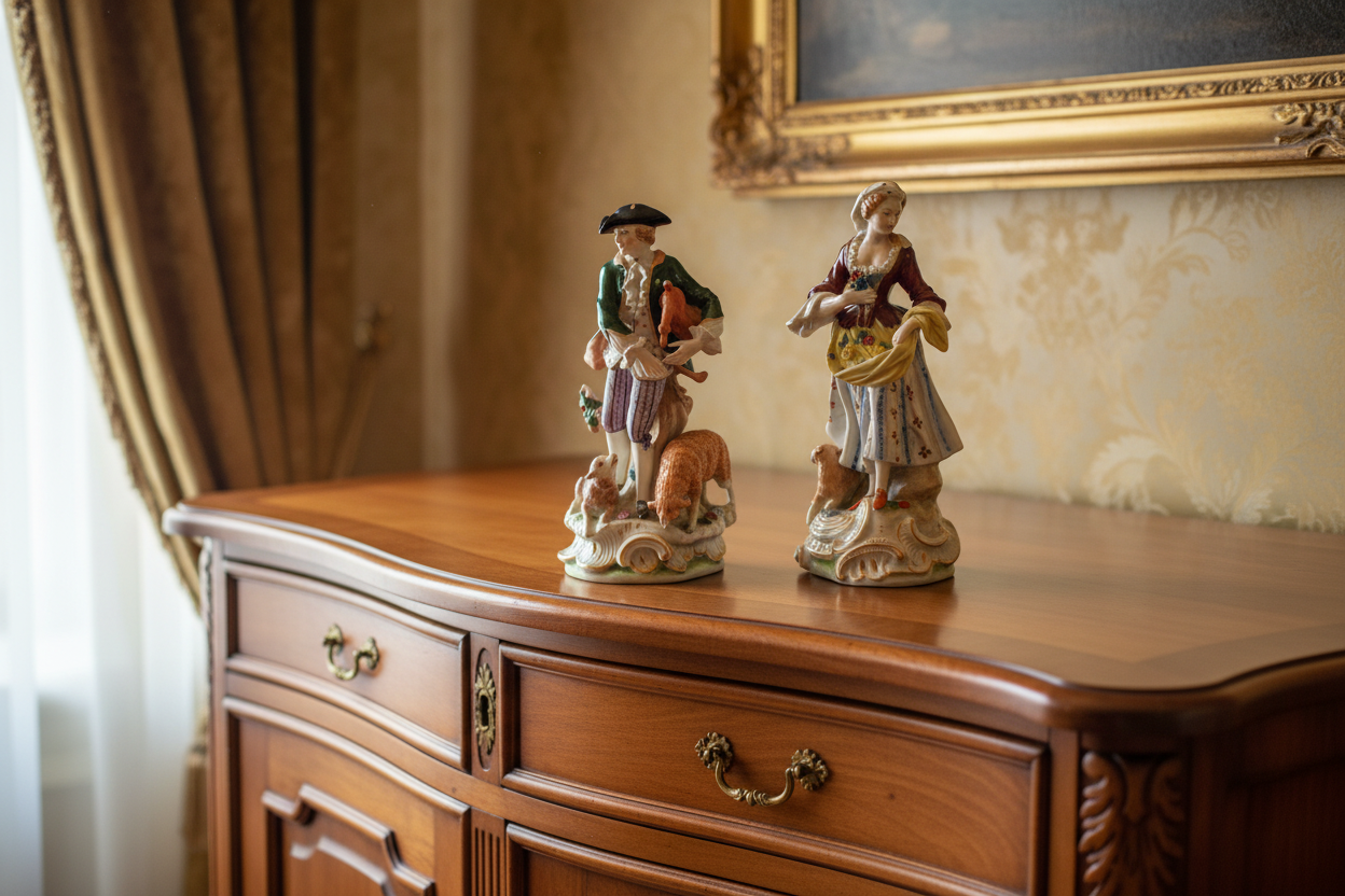 Le due sculture raffigurano una figura femminile e una maschile in abiti settecenteschi La donna è rappresentata nell’atto di raccogliere fiori,L’uomo, probabilmente suo pendant, indossa abiti d’epoca coordinati, con giacca lunga, panciotto e calzoni al ginocchio.