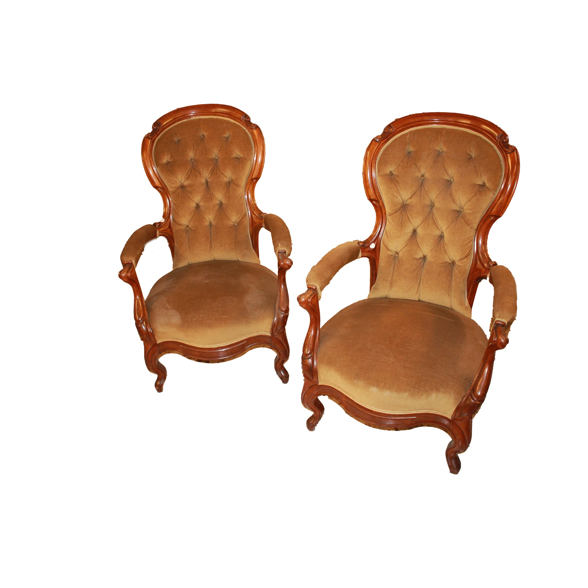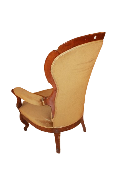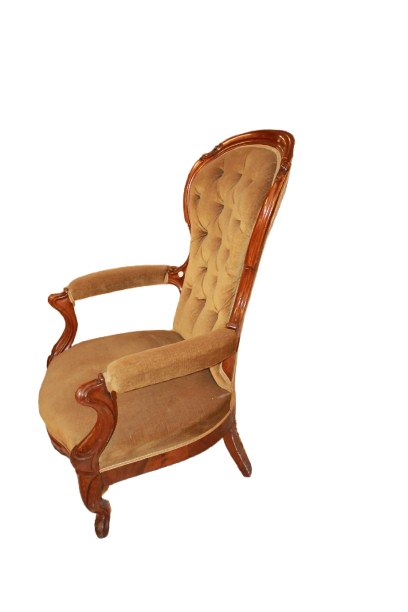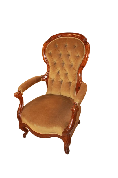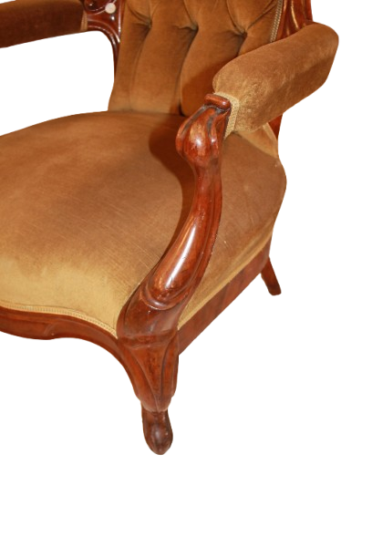 Coppia di poltrone francesi della seconda metà del 1800 in legno di noce. Finemente sagomato e lucidato. La poltrona presenta uno schienale alto e sagomato con lavorazione capitonné, impreziosito da bottoni che creano il tipico motivo trapuntato.I braccioli mossi e scolpiti si raccordano armoniosamente con la struttura, mentre le gambe anteriori leggermente arcuate conferiscono slancio ed eleganza