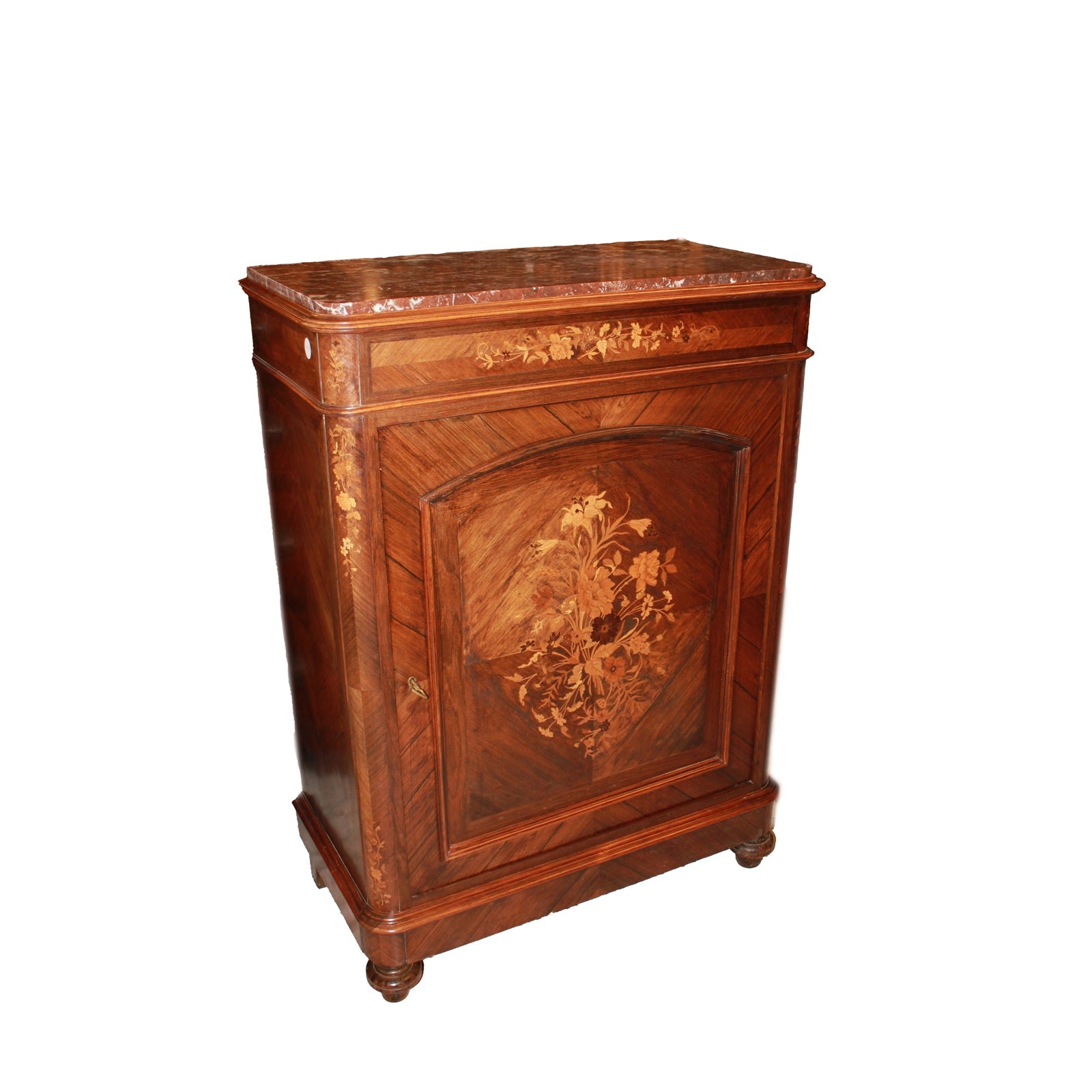 Magnifica credenza francese ad 1 porta della seconda metà del 1800 in legno di palissandro. Presenta piano superiore in marmo Rosso Francia, 1 anta centrale e ricchi motivi di intarsio floreale su tutta la superficie; termina con piedini a cipolla. Internamente dotata di ripiano.
