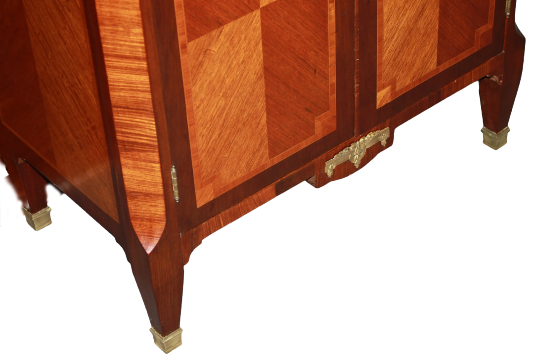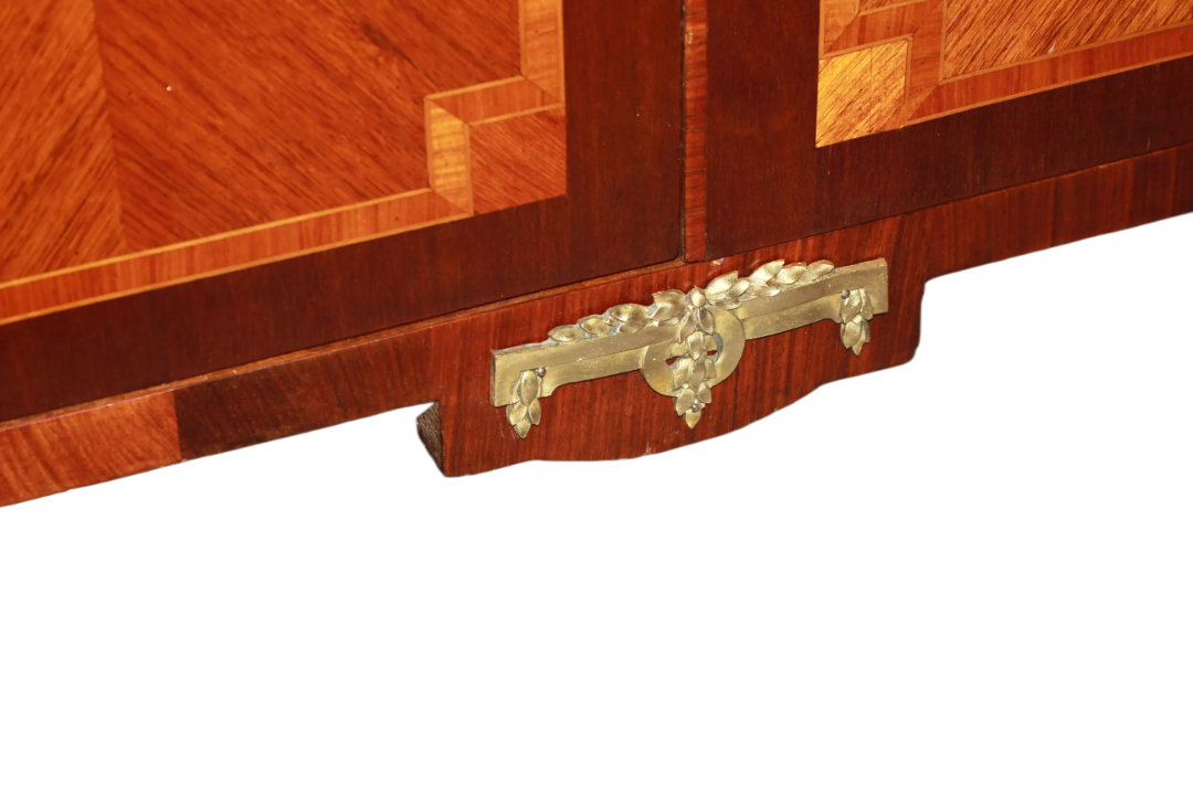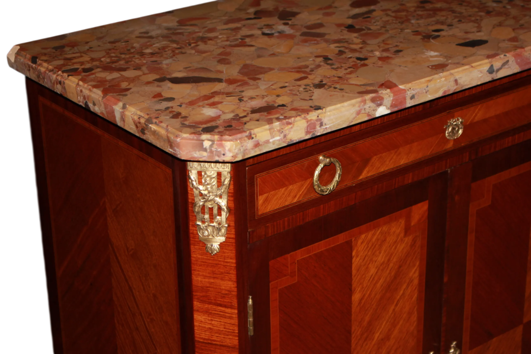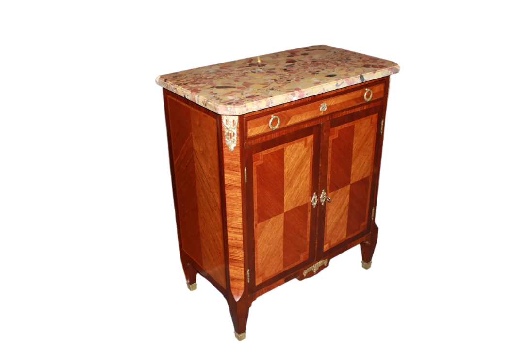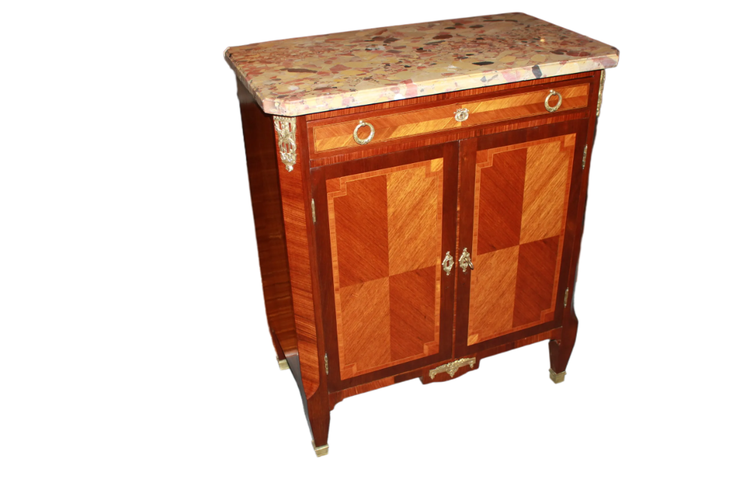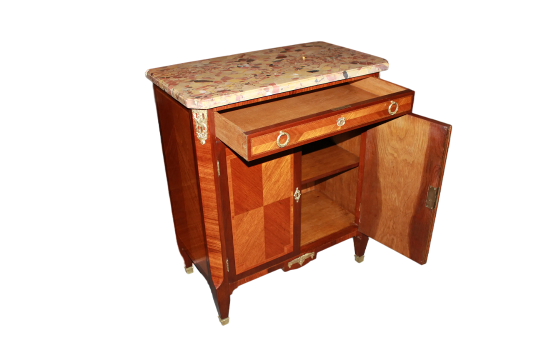 Credenzino francese della seconda metà del 1800, stile Transizione, in legno di bois de rose. Presenta piano in marmo macchia vecchia, cassetto sottopiano, 2 antine chiuse e applicazioni in bronzo.