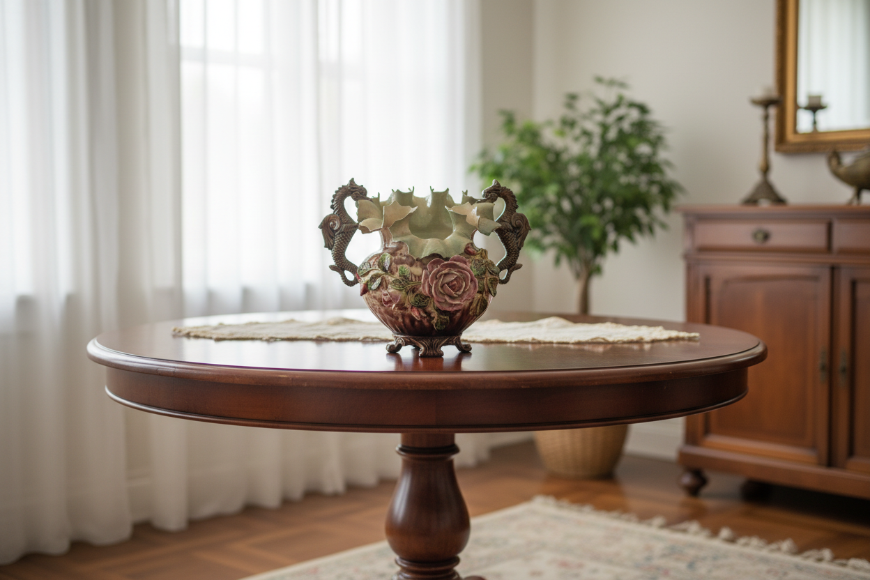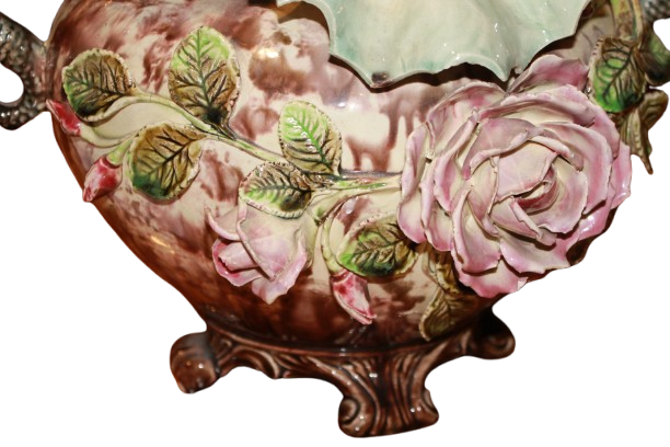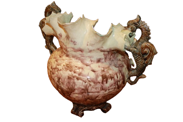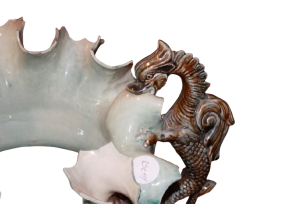 Di gusto tardo Ottocento / primo Novecento, caratterizzato da una composizione ricca e scenografica il corpo principale presenta una forma bombata raffigurante grande rosa e le anse laterali, sono modellate a forma di cavallucci marini
